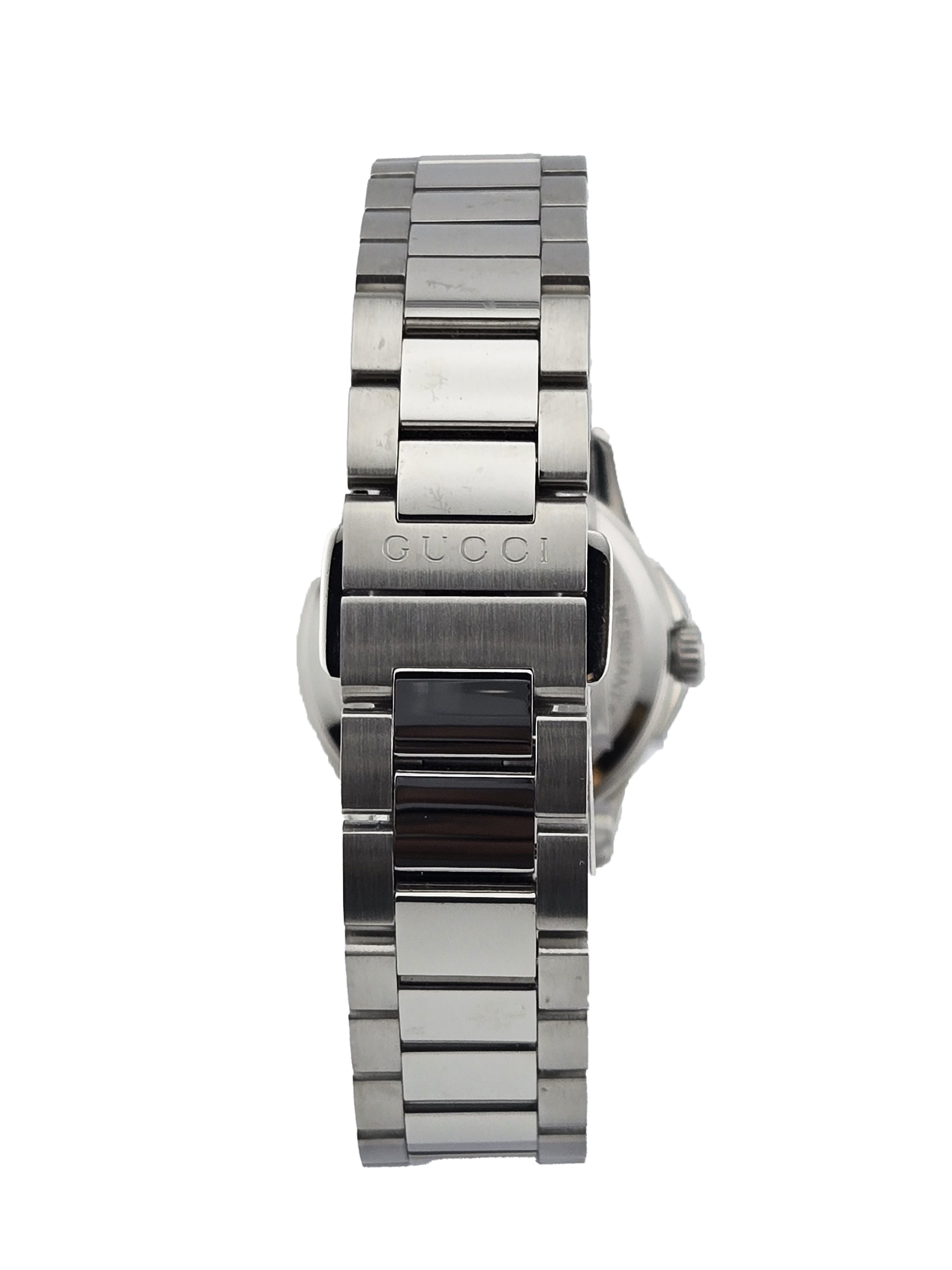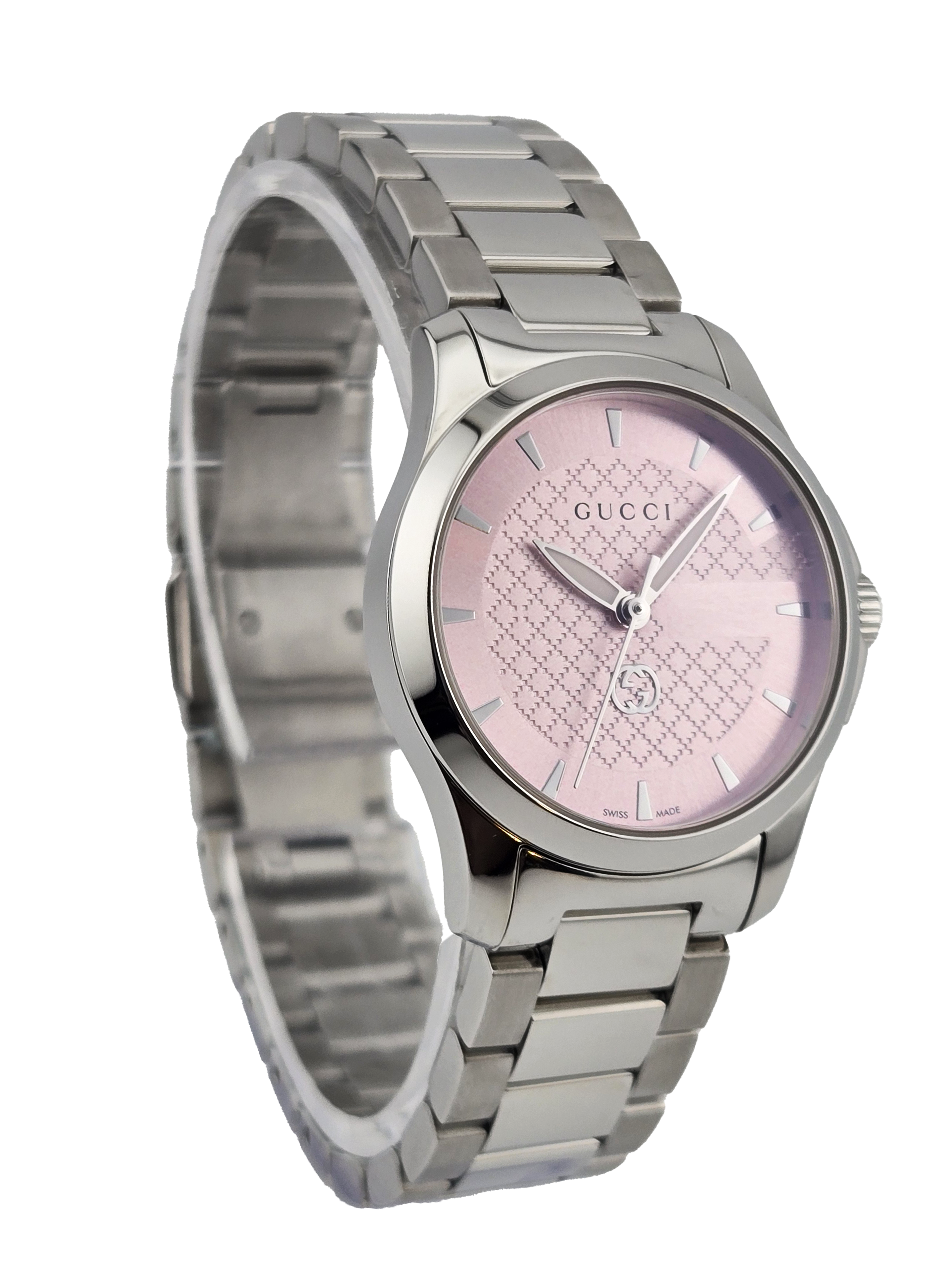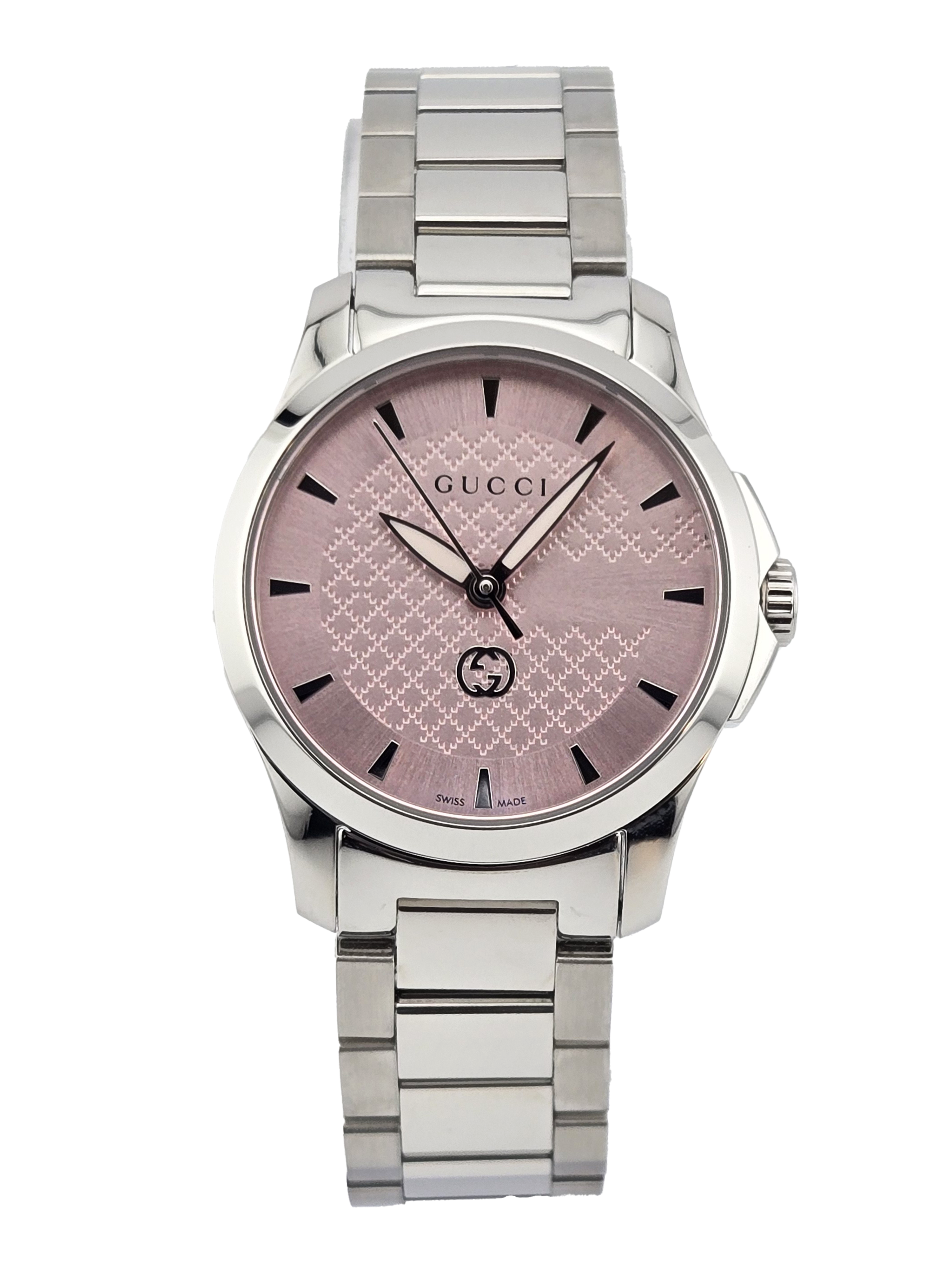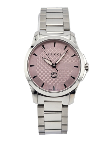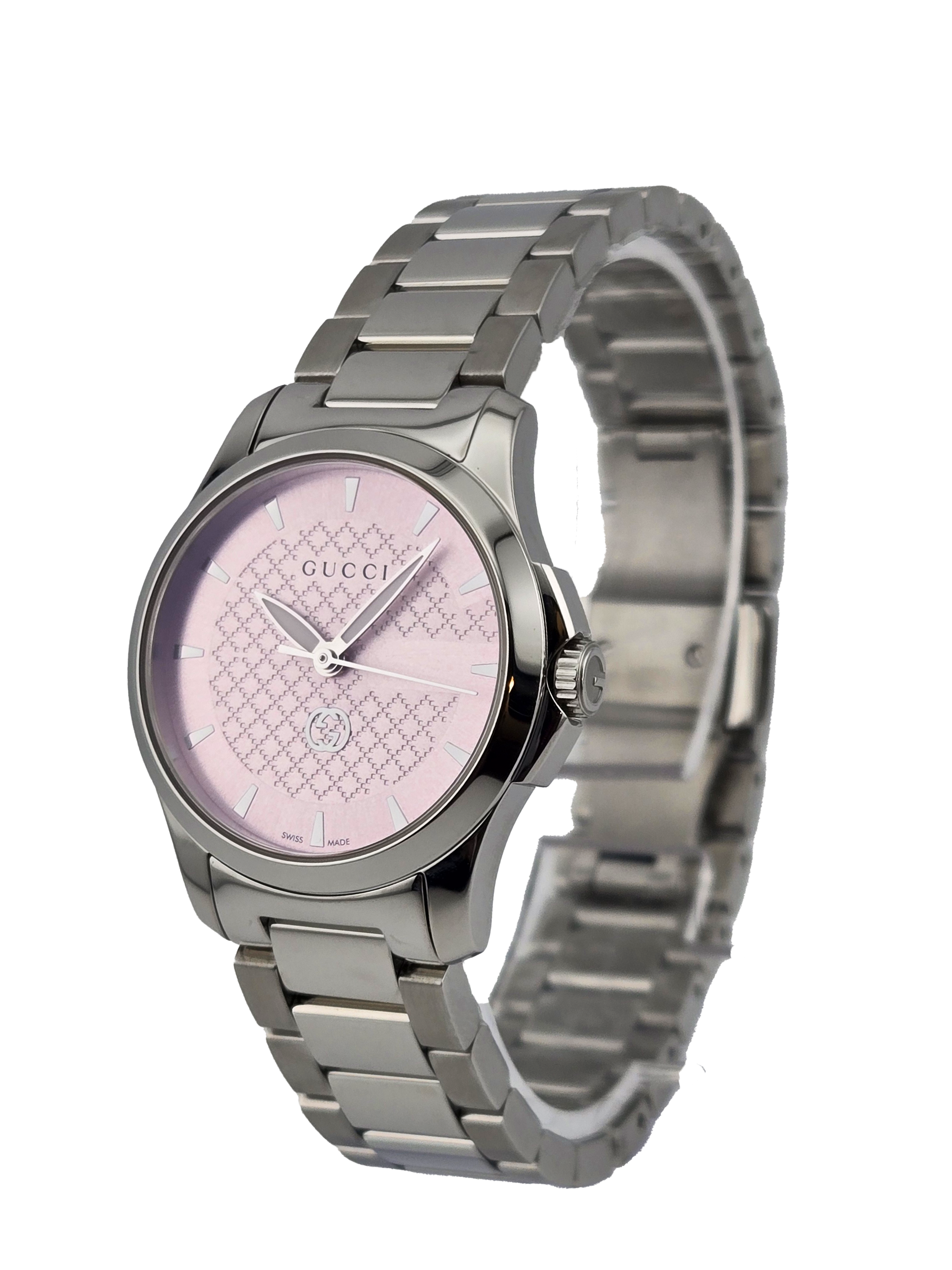 Brighten your wrist with the Gucci G-Timeless YA1265047 Women's Pink Dial Watch. This charming timepiece features a delightful pink dial housed in a 27 mm stainless steel case, combining elegance with modern flair. Powered by Swiss quartz movement and protected by scratch-resistant sapphire crystal, it ensures both style and durability. With a water resistance of 5 ATM (50 meters/160 feet), it’s perfect for everyday wear. Elevate your accessory game with the timeless sophistication of Gucci!