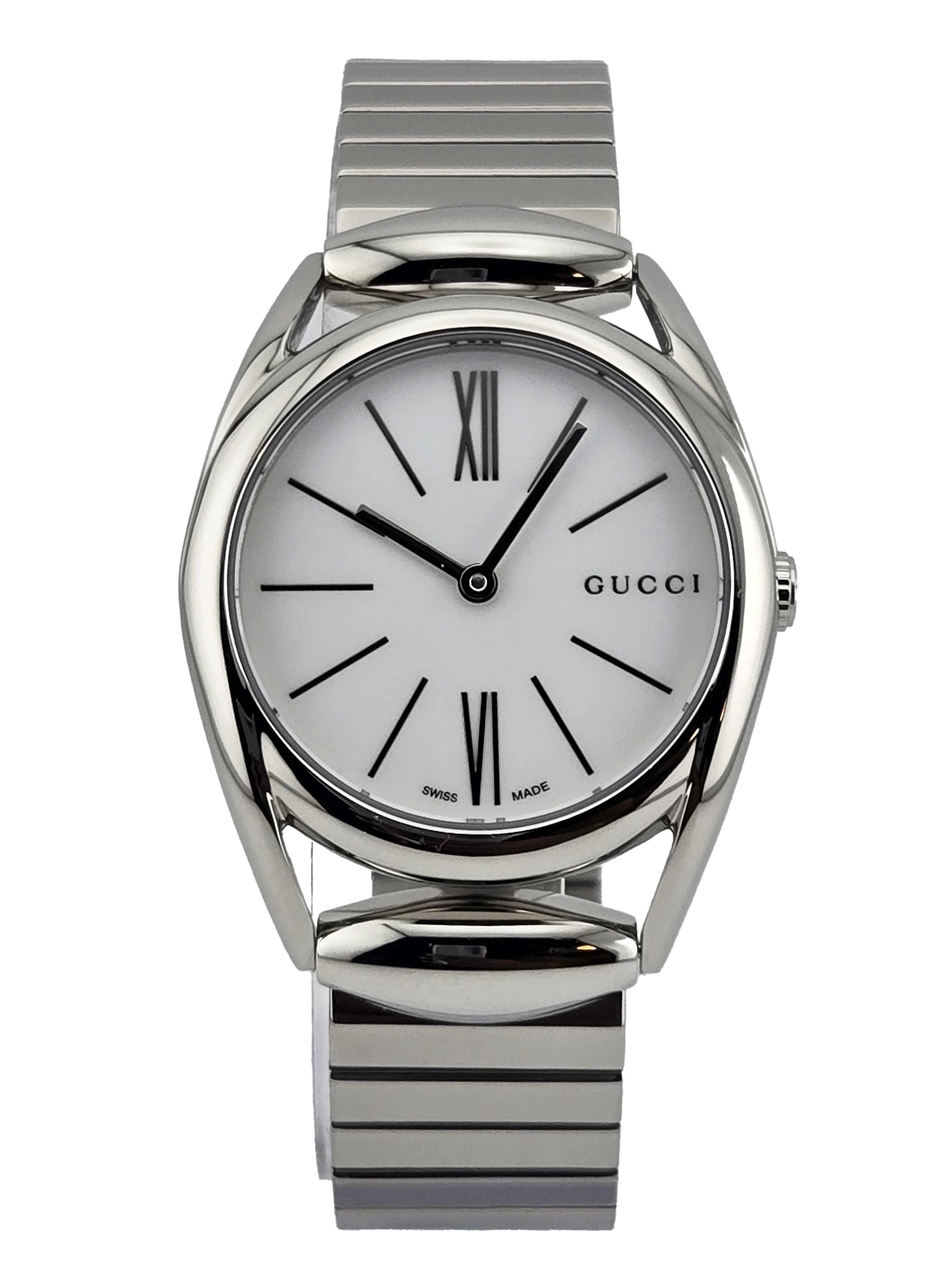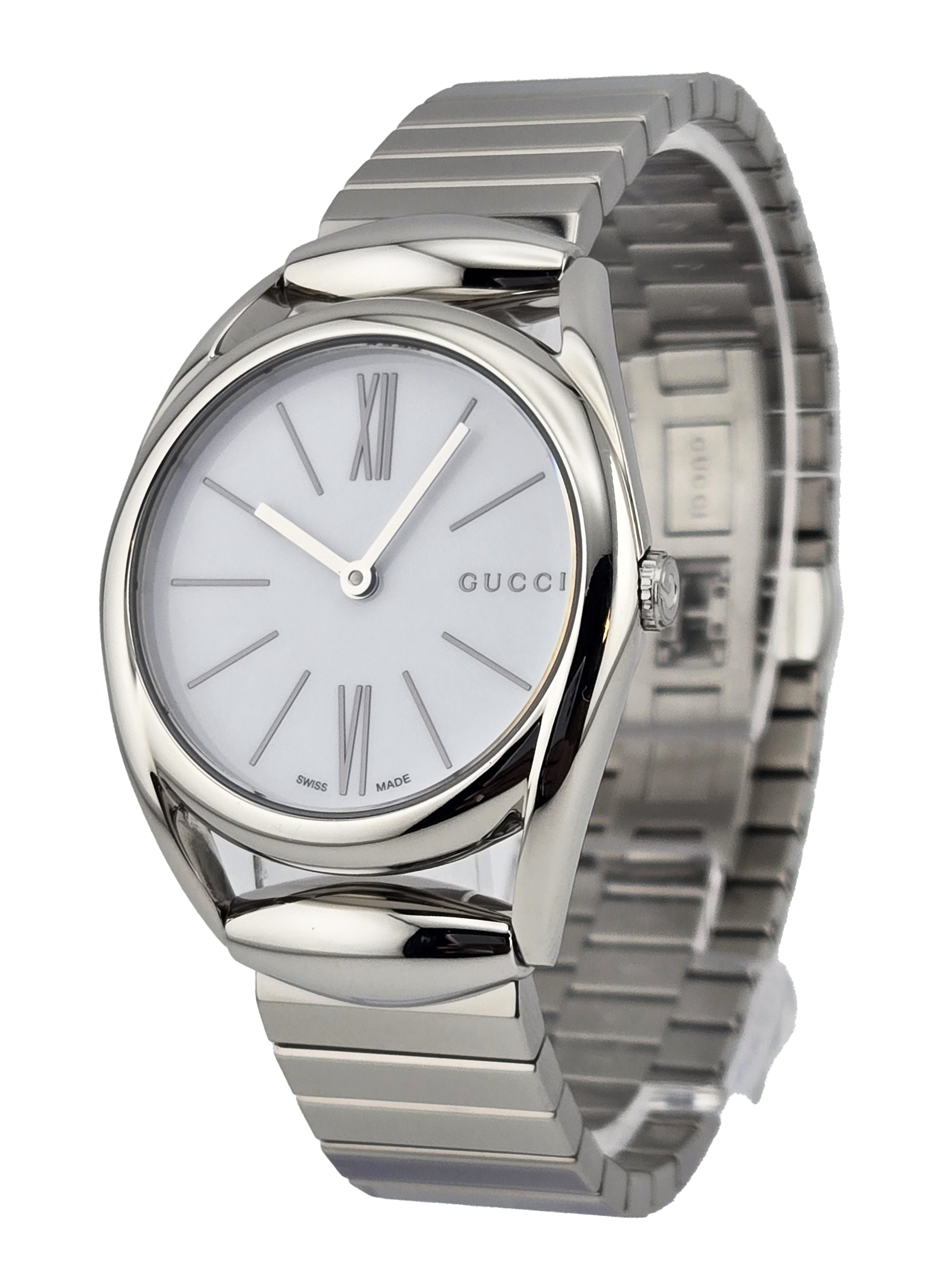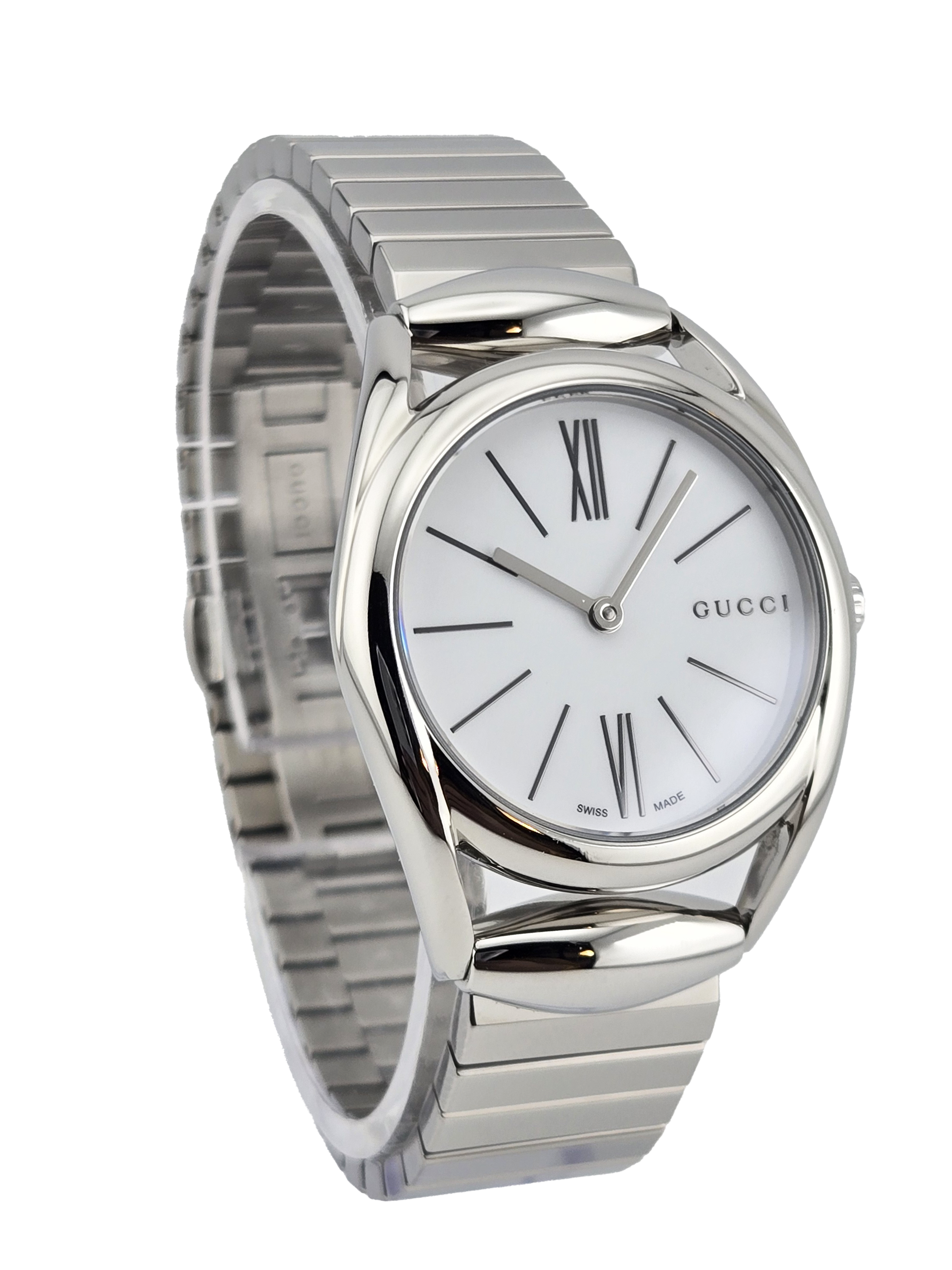 The Gucci Horsebit Women's Watch - YA140505 features a 30 mm stainless steel case and bracelet with a clean white dial, silver-tone hands, and Roman numerals at 6 and 12 o’clock for a classic touch. Powered by quartz movement and protected by a sapphire crystal, it combines elegance with reliable performance. Water-resistant up to 50 meters, it’s a versatile, refined choice for everyday wear.