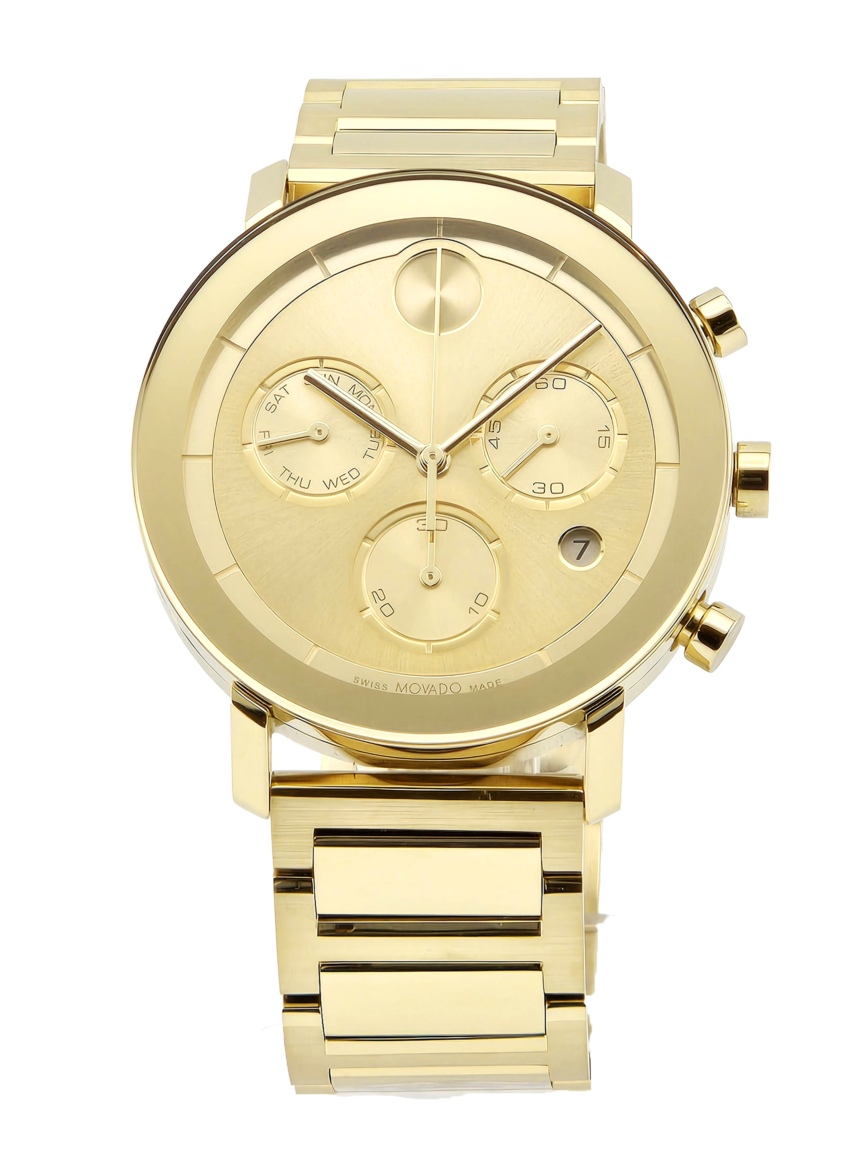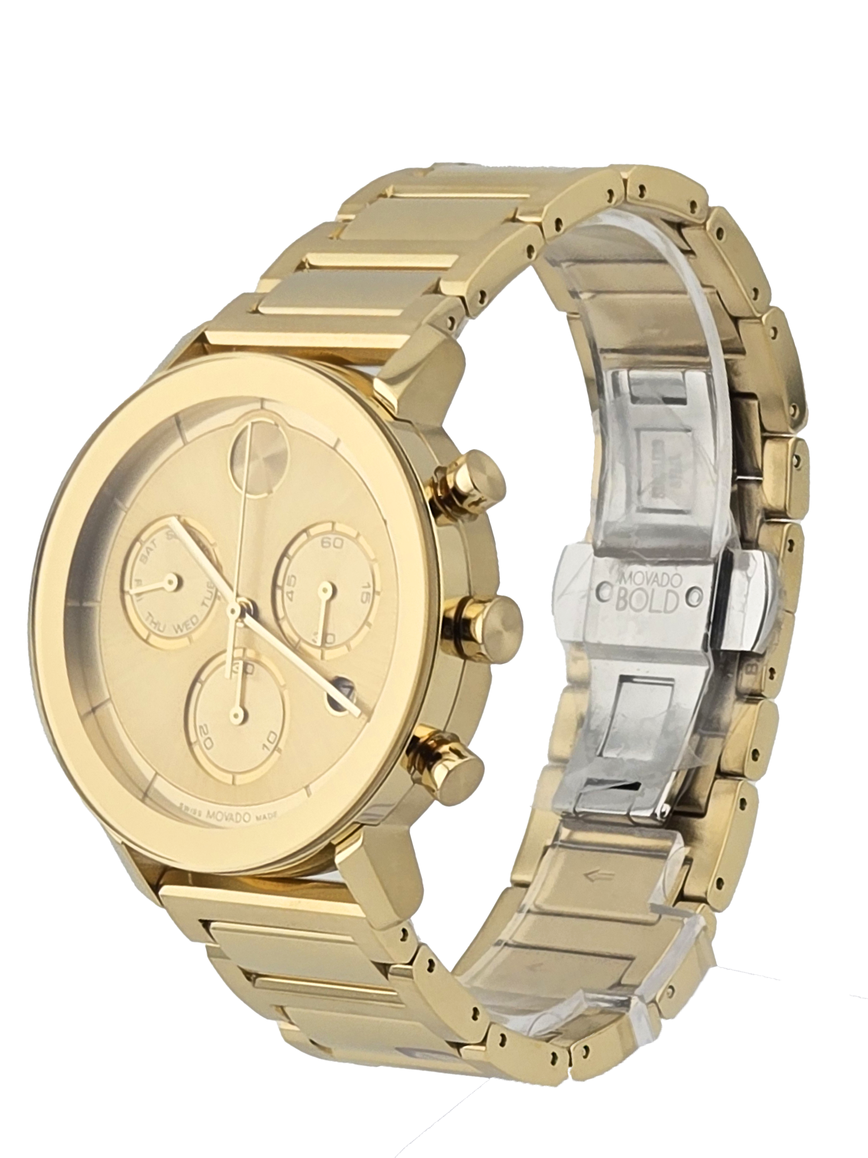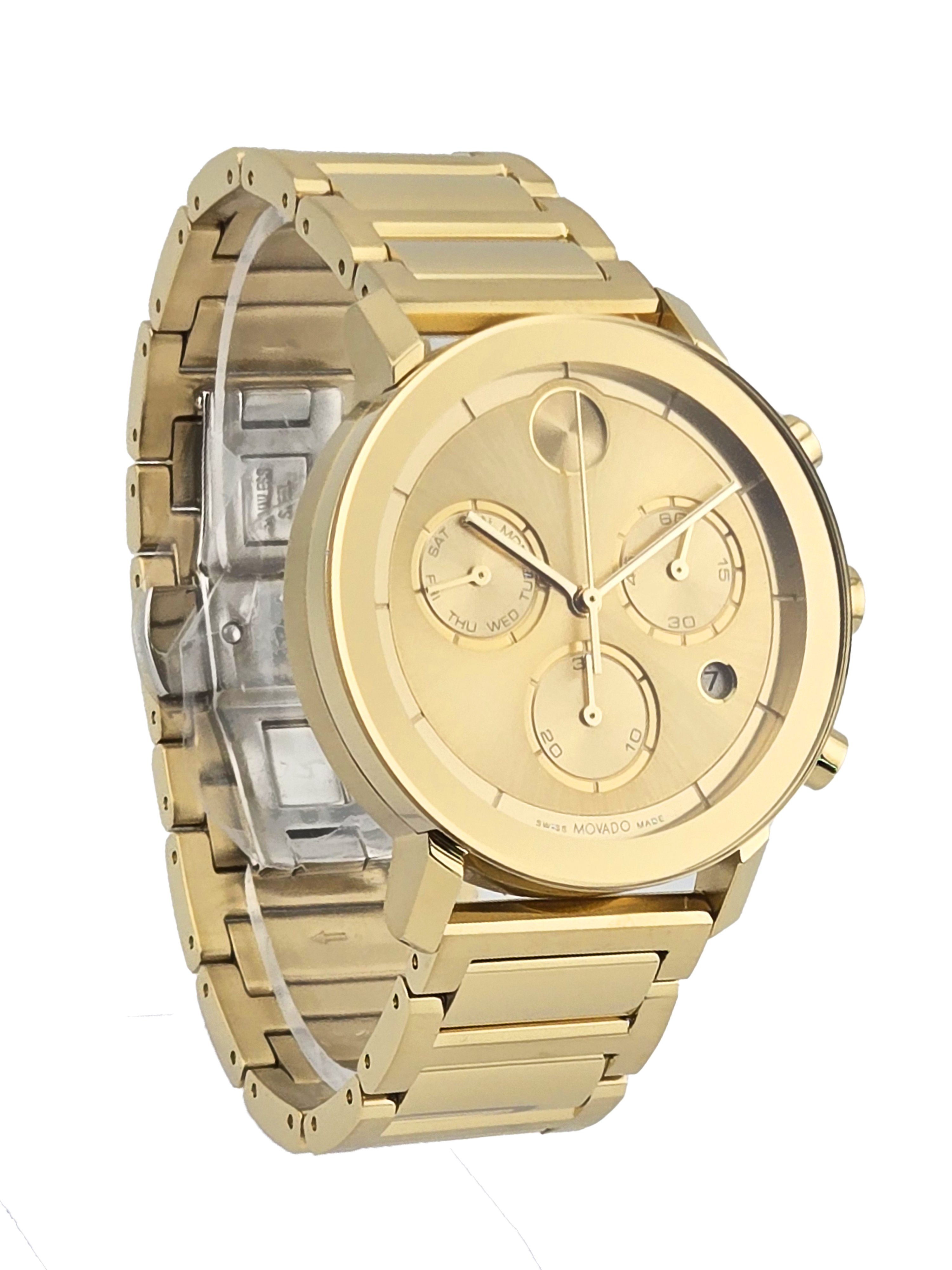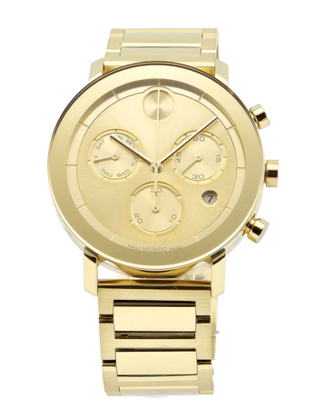 The Movado Bold Men's Light Gold Dial Stainless Steel Watch (3600811) showcases a sleek monochromatic design with its yellow gold IP stainless steel case, bracelet, and fixed bezel. The light gold dial features gold-tone hands, index markers, the signature Movado dot at 12 o’clock, and three chronograph sub-dials for 60-second, 30-minute, and day functions, along with a date display at 4 o’clock. Powered by precise quartz movement and protected by a scratch-resistant K1 crystal, this 42mm watch combines durability with style. A secure deployment clasp and 30-meter water resistance make it a versatile and elegant accessory for any occasion.