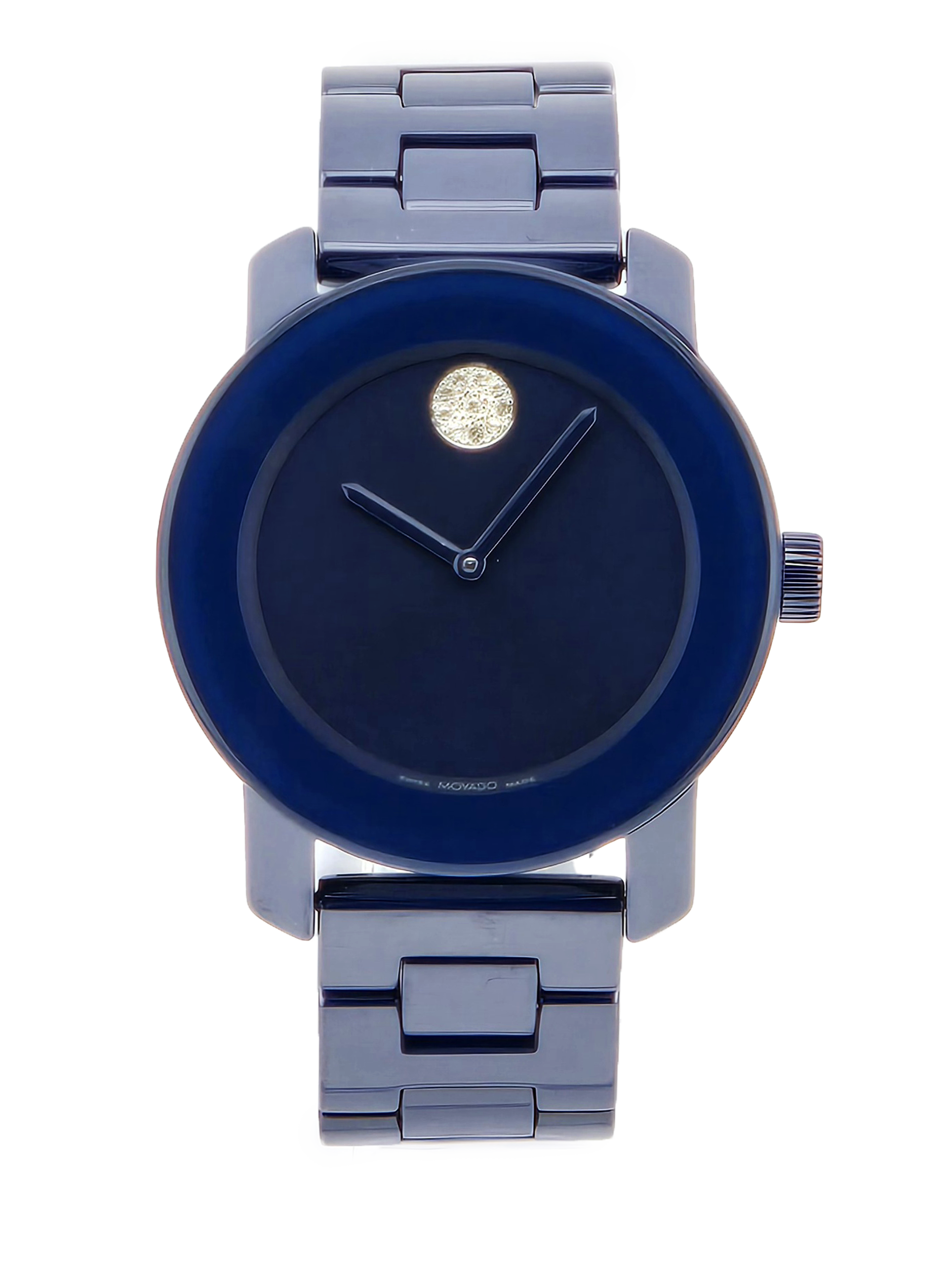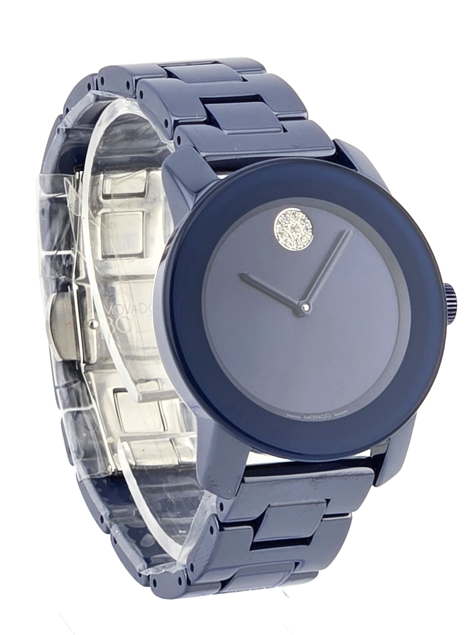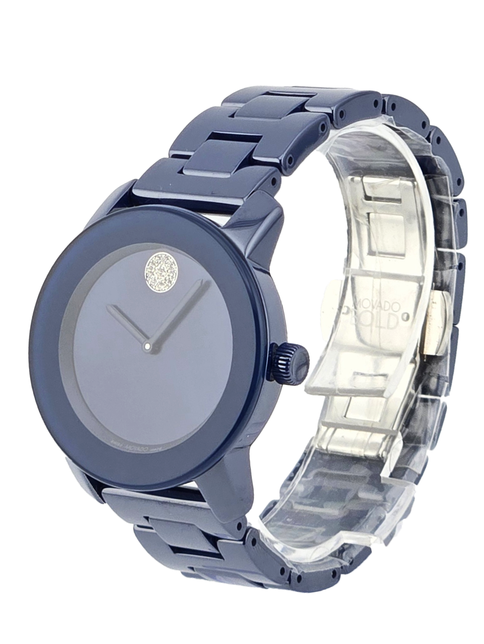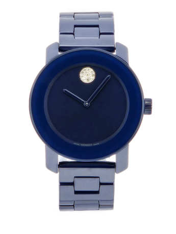 The Movado Women's Bold Evolution Blue Dial Ceramic Watch - 3600805 features a striking all-blue design with a 36 mm blue IP ceramic case, matching bracelet, and minimalist dial highlighted by the iconic Movado dot. Powered by quartz movement and protected by a scratch-resistant K1 crystal. Finished with a push-button deployment clasp and water resistance up to 30 meters, it’s a bold accessory for everyday wear.