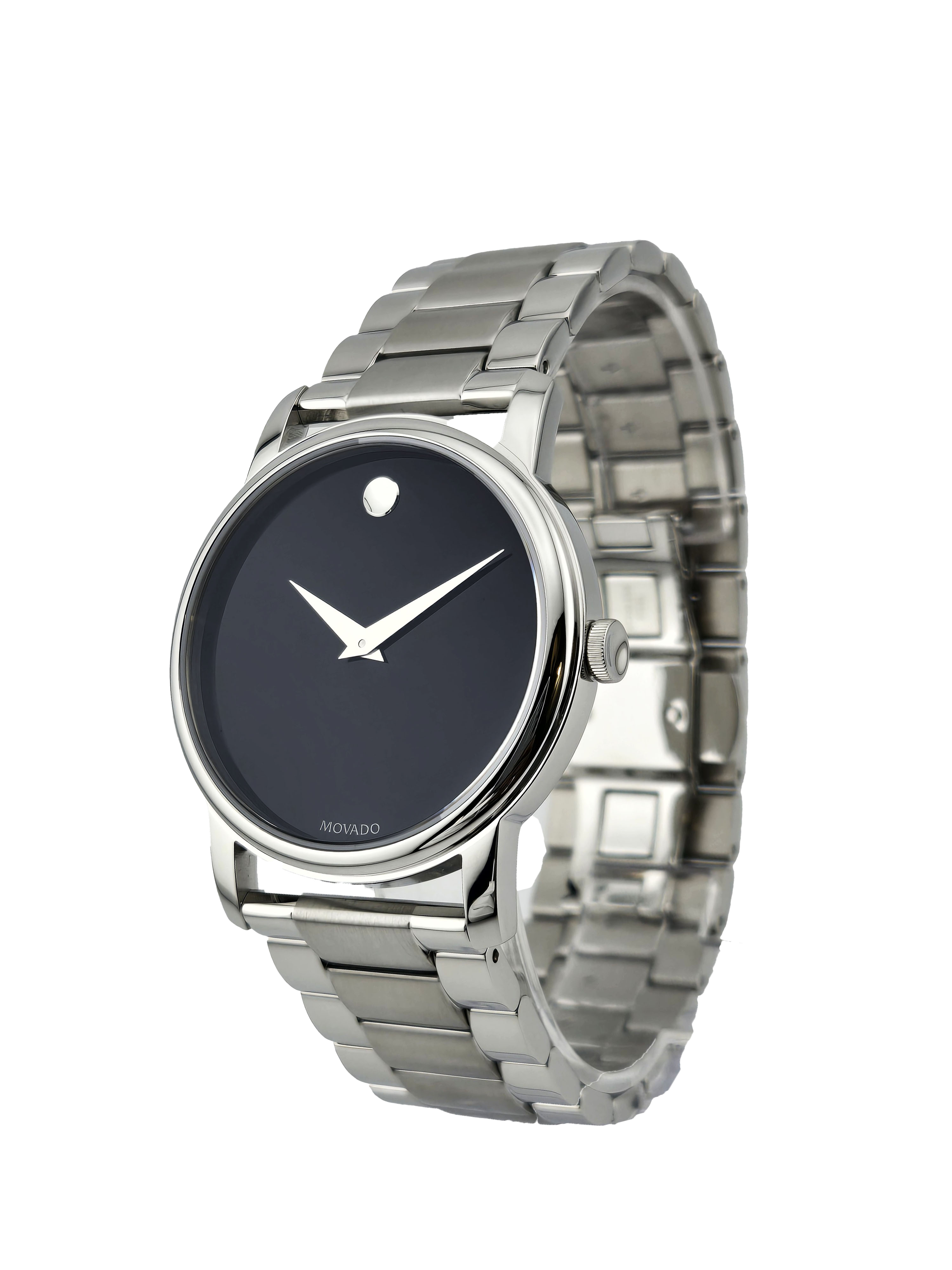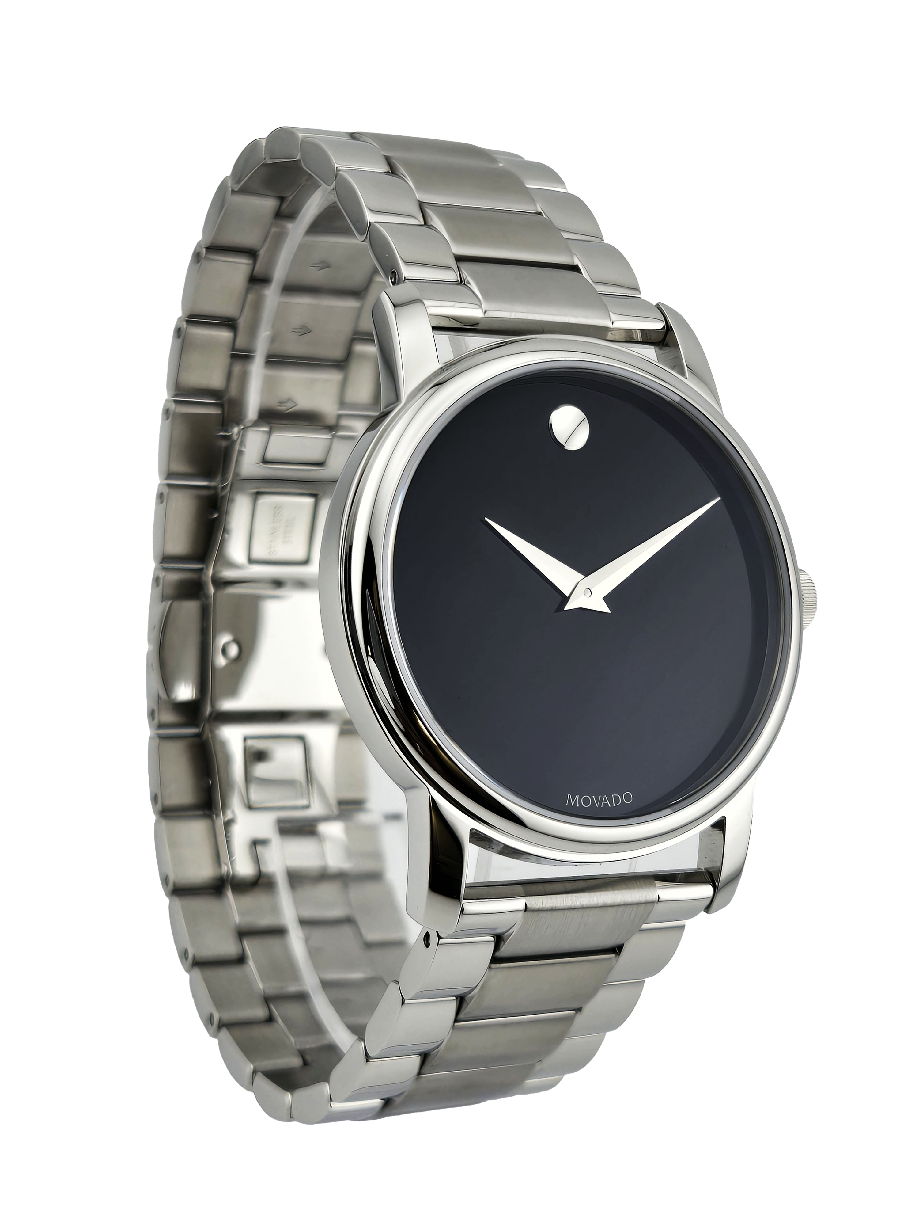 The Movado Men’s Classic Museum Black Dial Quartz Watch (Model: 2100014) features a stainless steel case, black dial with the iconic Movado dot, and silver-tone hands. Powered by quartz movement and protected by sapphire crystal, this 38mm watch offers precision, durability, and 30m water resistance.