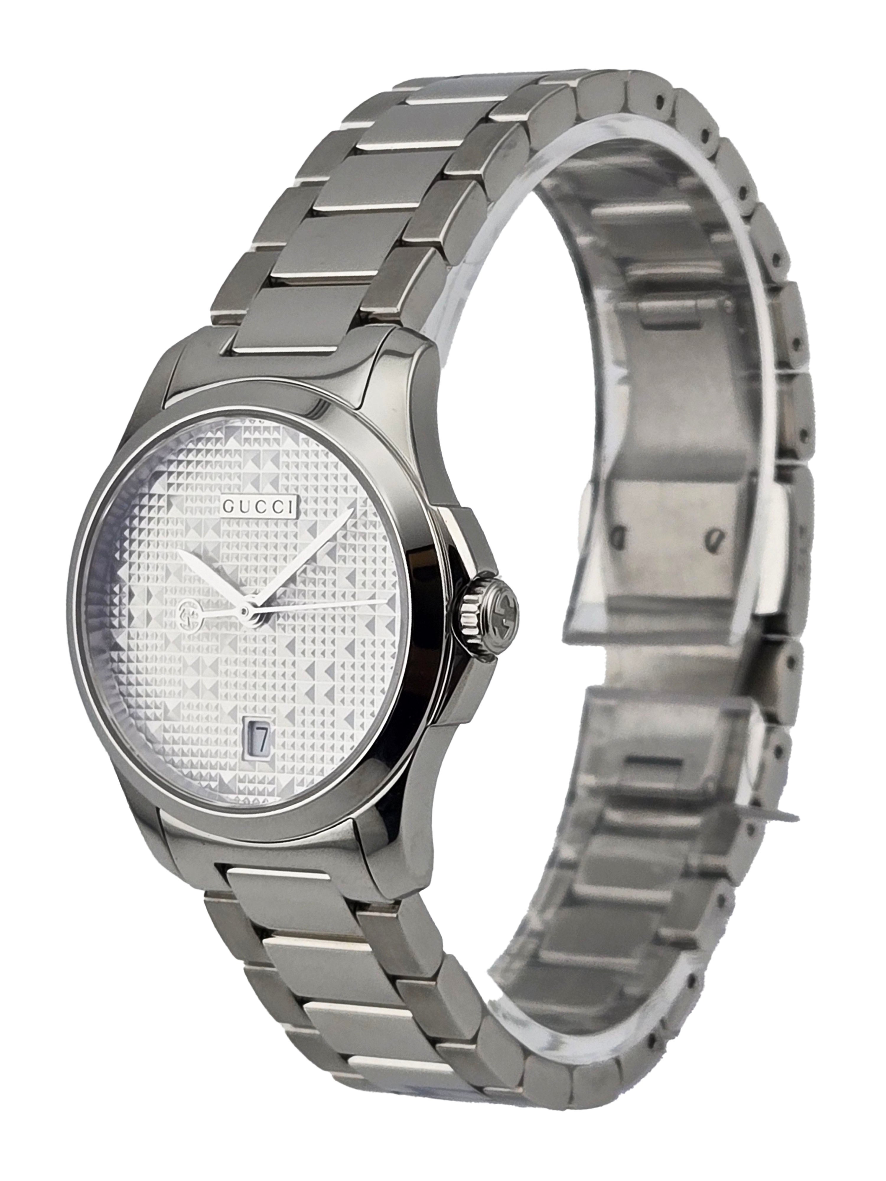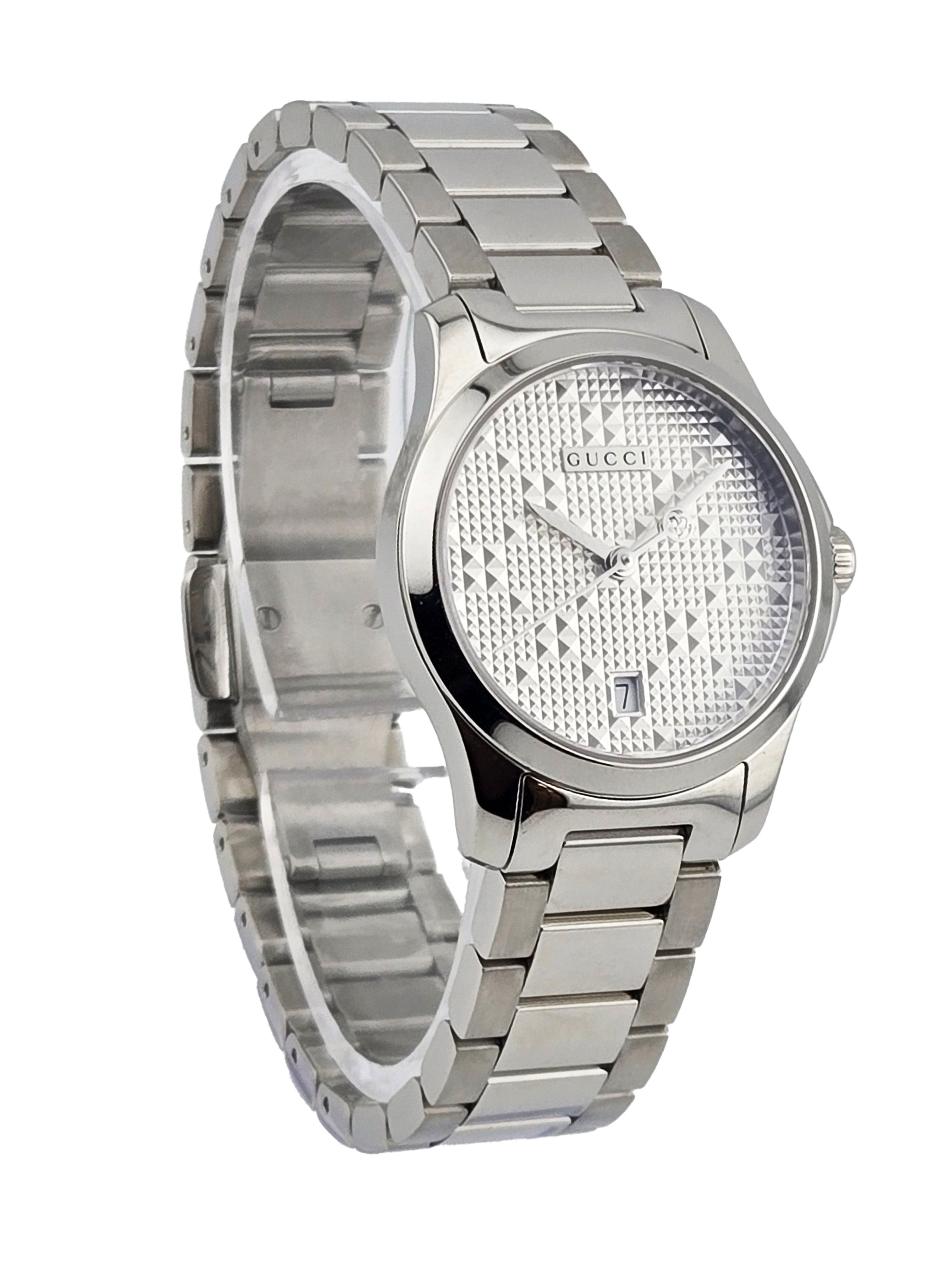 The Gucci G-Timeless Women’s Stainless Steel Swiss Watch – YA126551 is a refined and versatile timepiece featuring a polished stainless steel case and bracelet paired with a silver diamante dial and silver-tone hands. Powered by a precise quartz movement and protected by a scratch-resistant sapphire crystal, it offers reliable everyday wear with a sleek 27 mm profile, a practical date display at 6 o’clock, and 50-meter water resistance, making it an elegant yet functional accessory for any occasion.