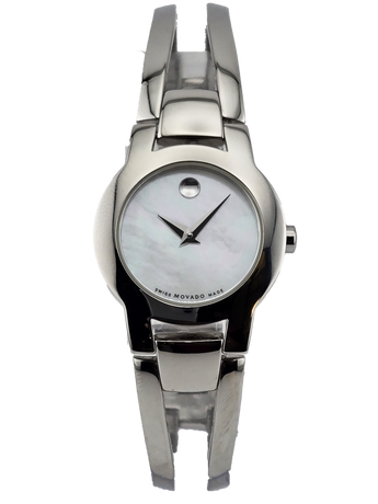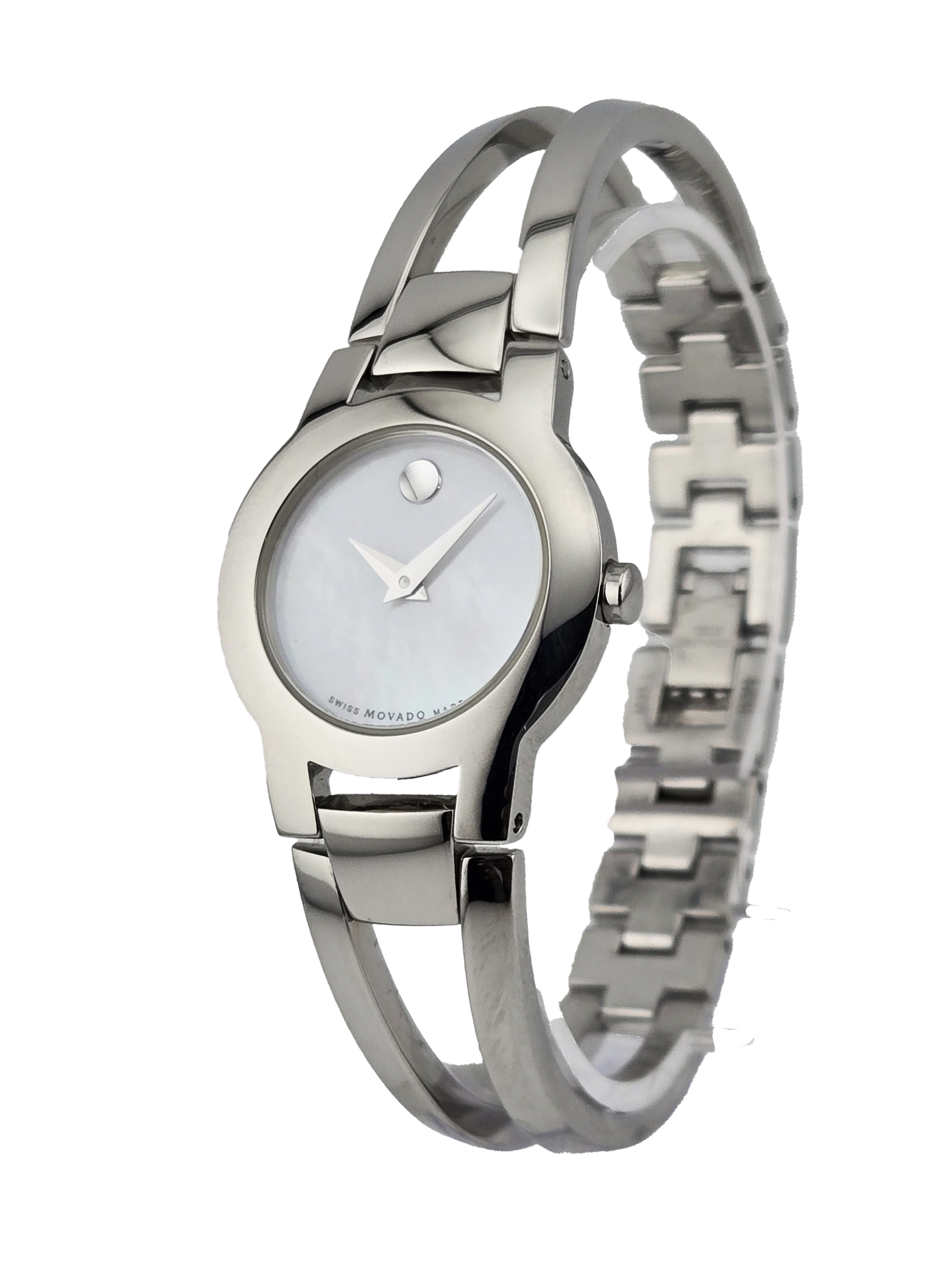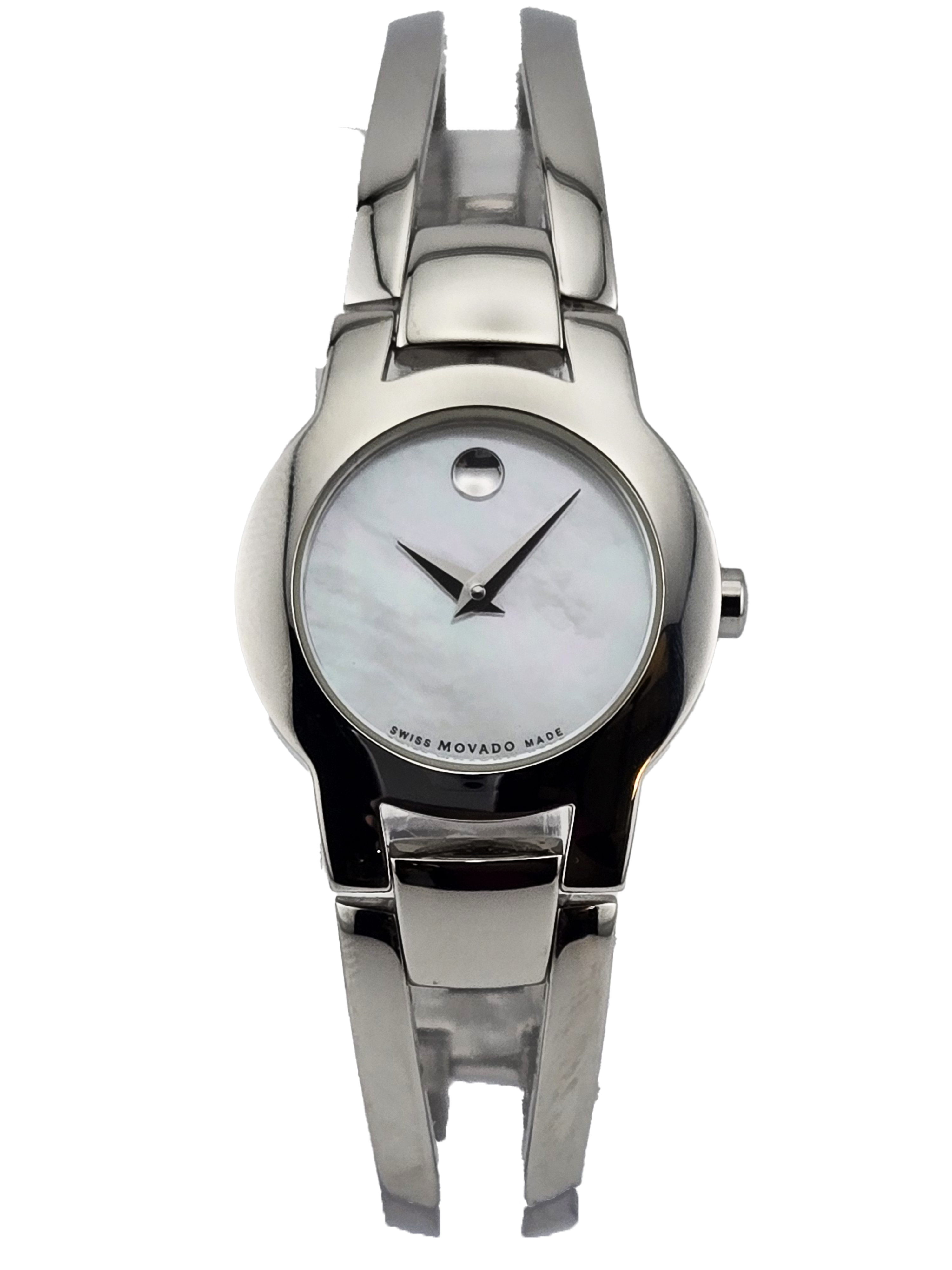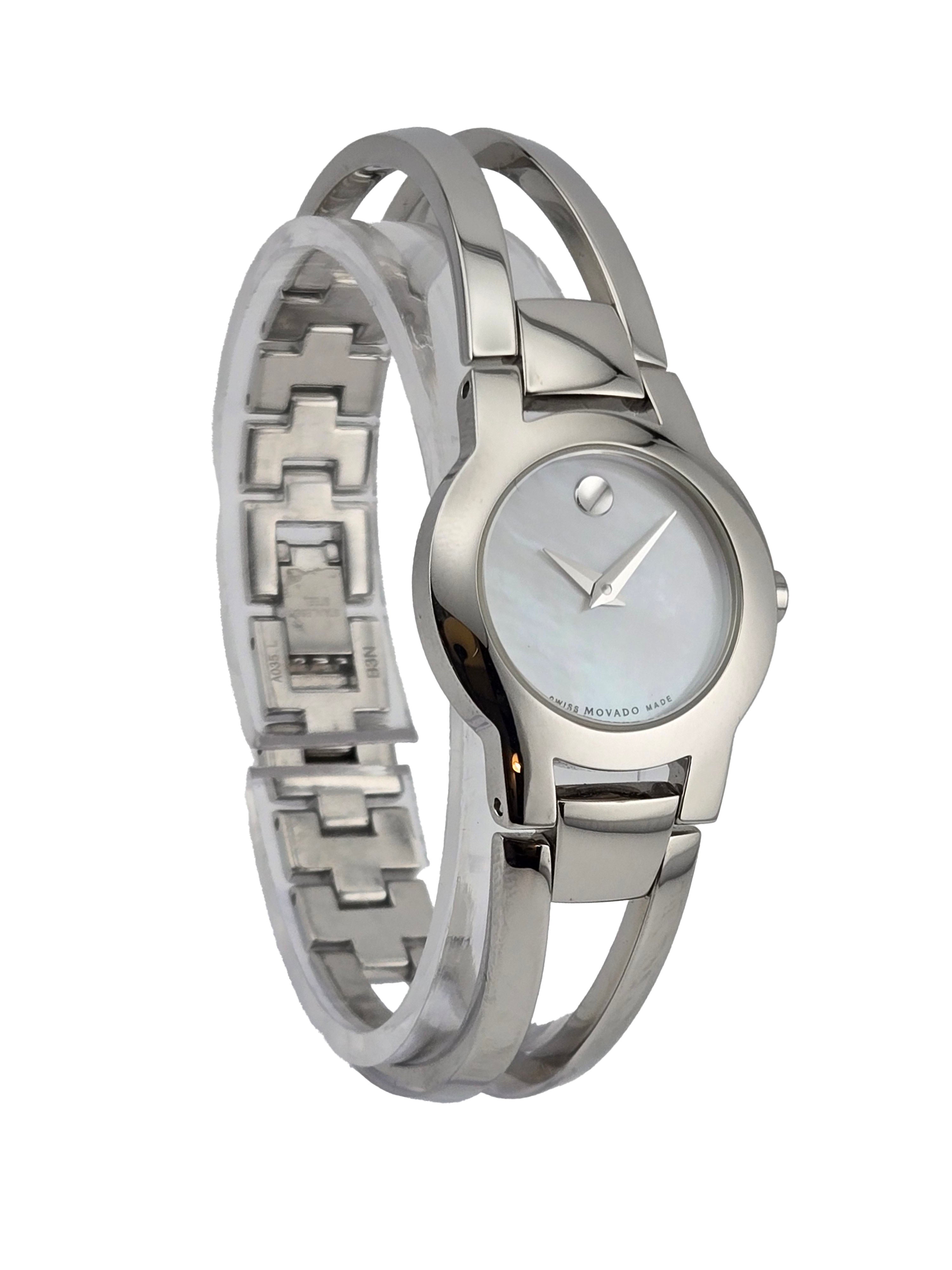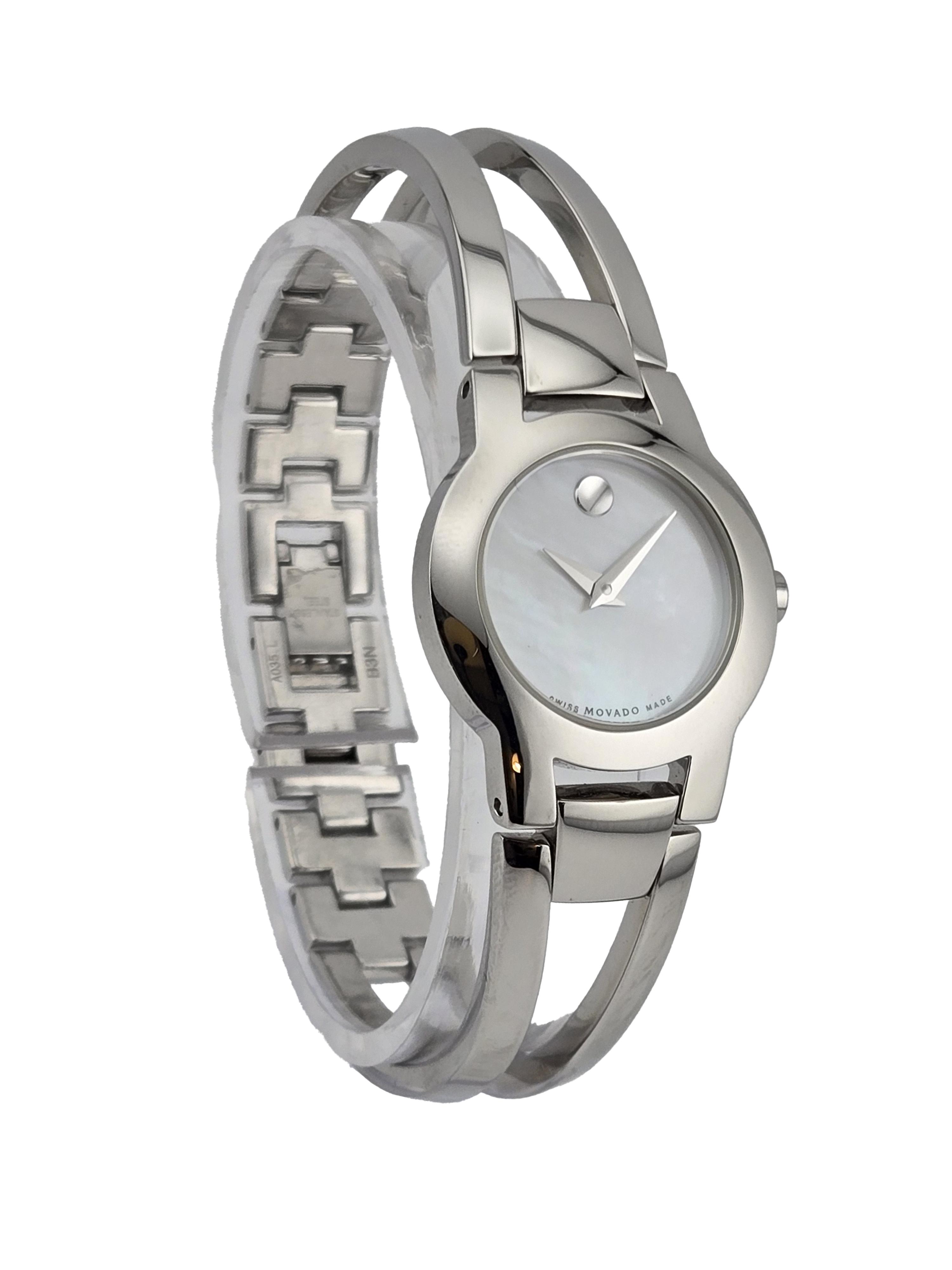 The Movado Women’s Amorosa Mother of Pearl Dial Swiss Watch (model 0606538) features a stainless steel case, mother-of-pearl dial, and silver-tone hands with the iconic Movado dot. With a 24mm case, Swiss quartz movement, and 30m water resistance, this elegant watch offers both style and practicality.