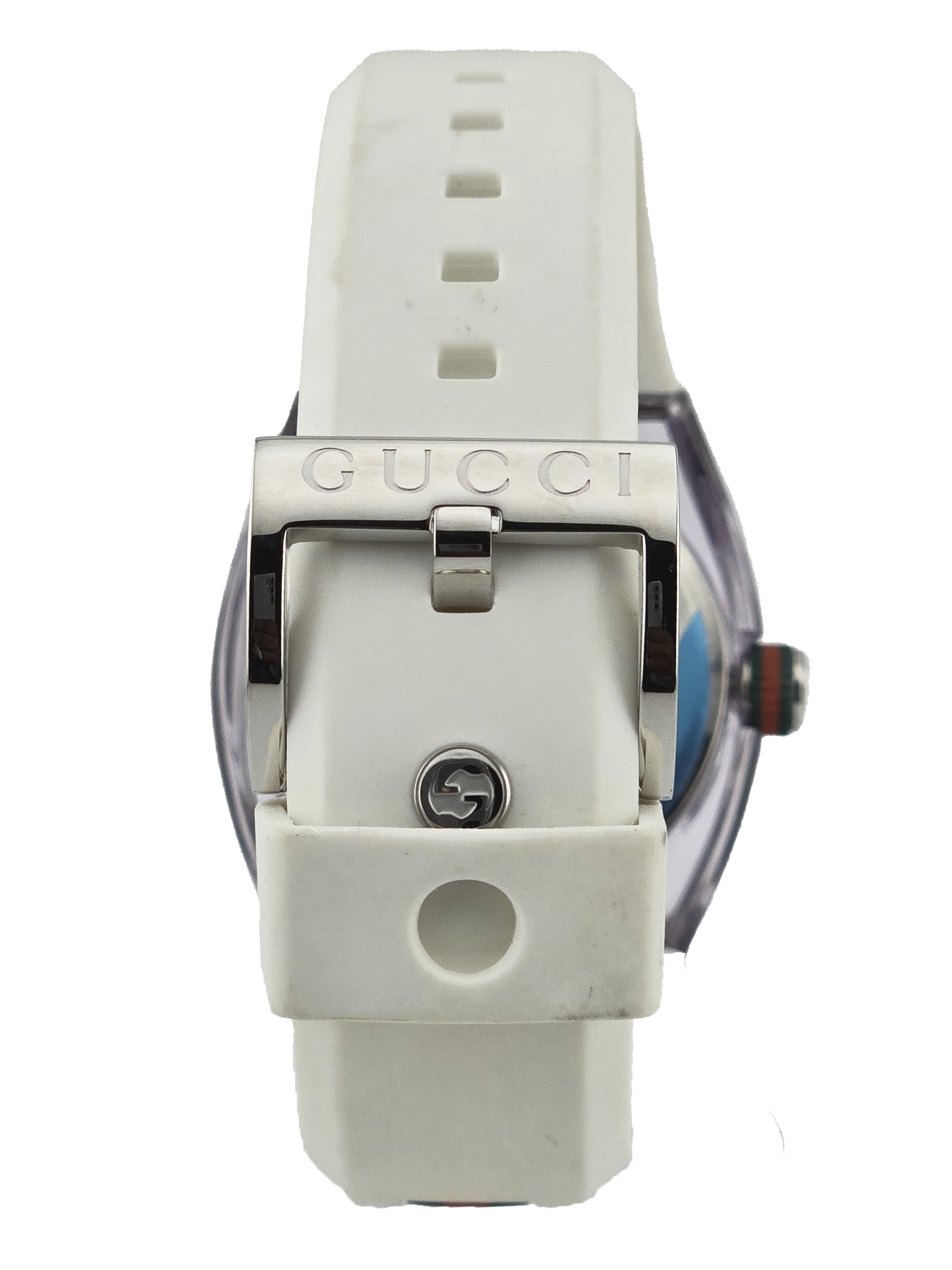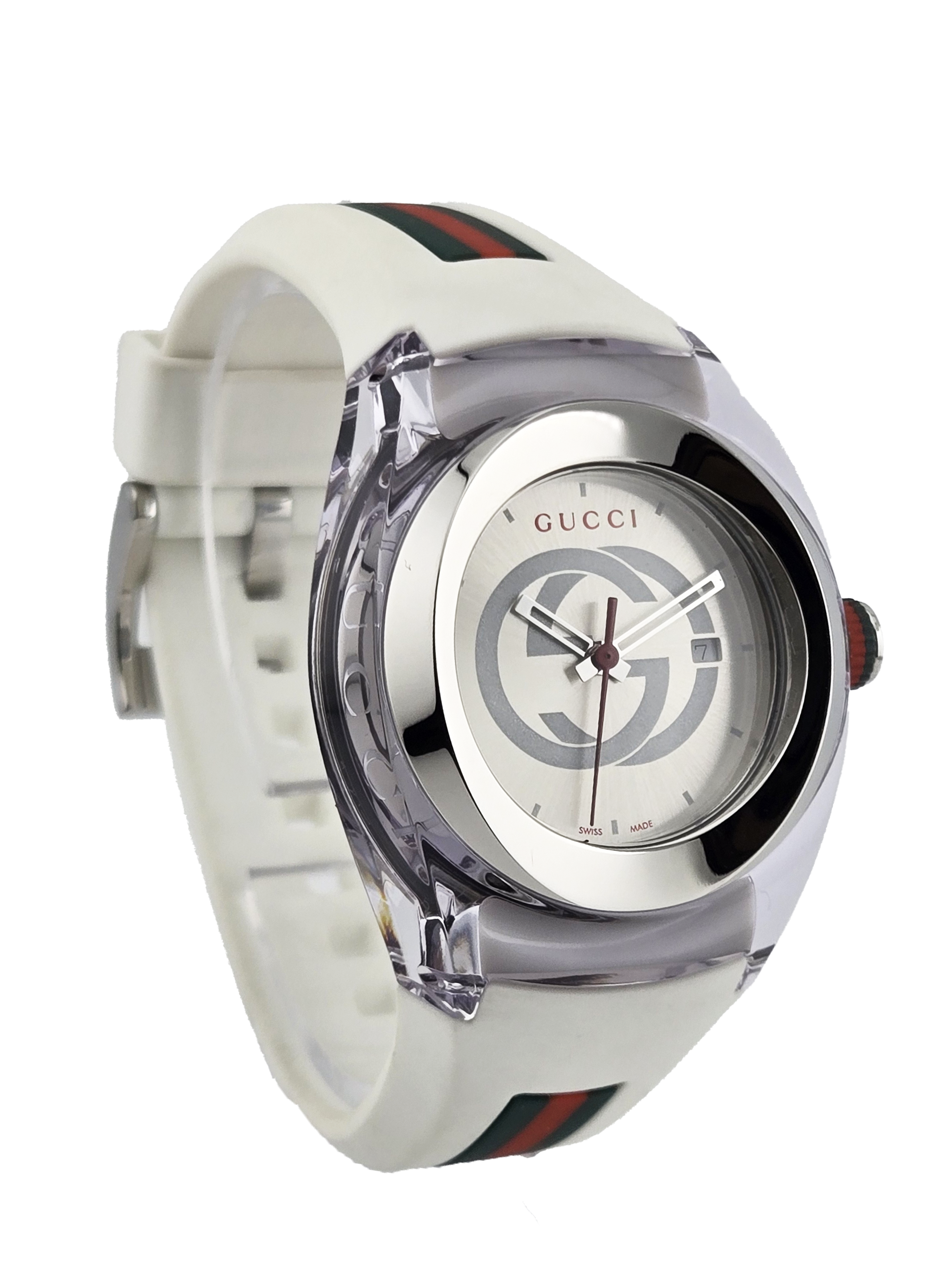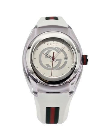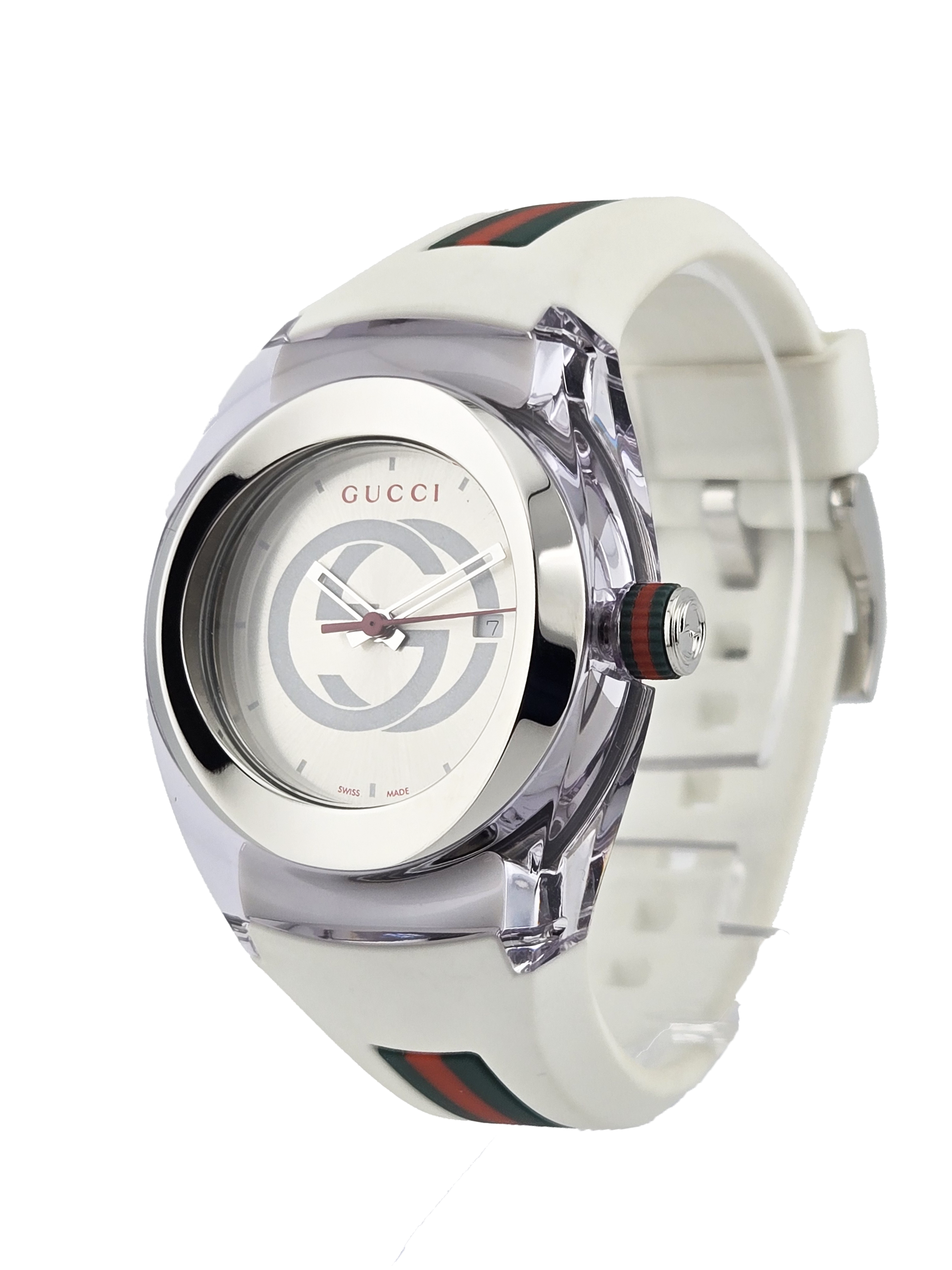 The Gucci Sync L YA137302 Women's Watch showcases a 36mm stainless steel case paired with a sleek white rubber strap. Its silver dial is protected by a durable mineral crystal, and the stainless steel bezel adds a polished touch. Featuring a comfortable buckle clasp and water resistance, this stylish timepiece offers both elegance and everyday functionality.