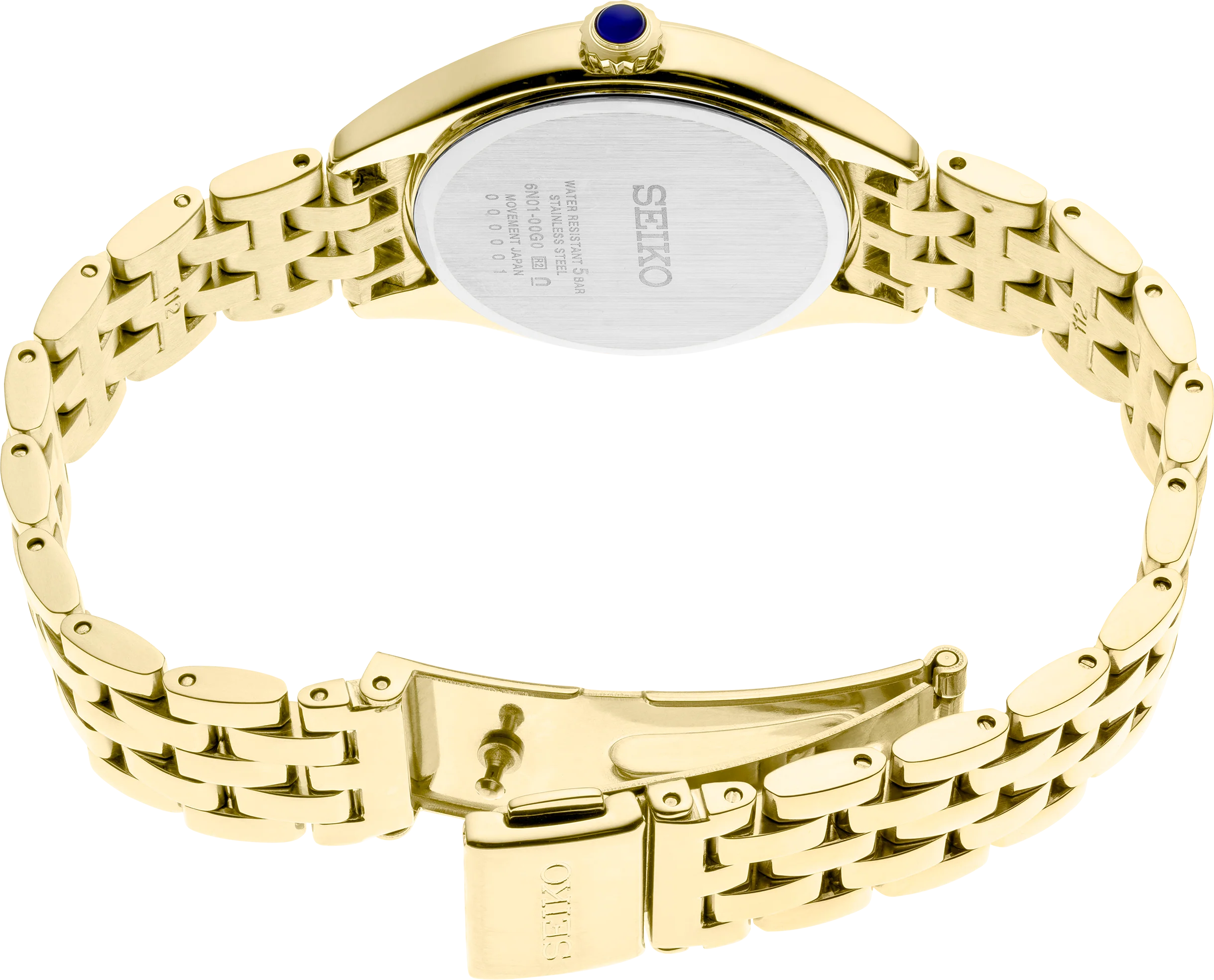 Elevate your elegance with the Seiko Essential SUR394 Women's Swarovski Crystal Bezel Watch. Featuring a stunning 29 mm case and a slim 6.98 mm thickness, this timepiece is adorned with a dazzling Swarovski crystal bezel. Powered by Seiko Caliber 6N01 quartz movement and protected by scratch-resistant Hardlex crystal, it ensures both style and durability. The 13 mm band width and fold-over clasp with push-button release offer a secure fit. With water resistance up to 50 meters (165 feet), this watch is perfect for any occasion. Shine with Seiko!