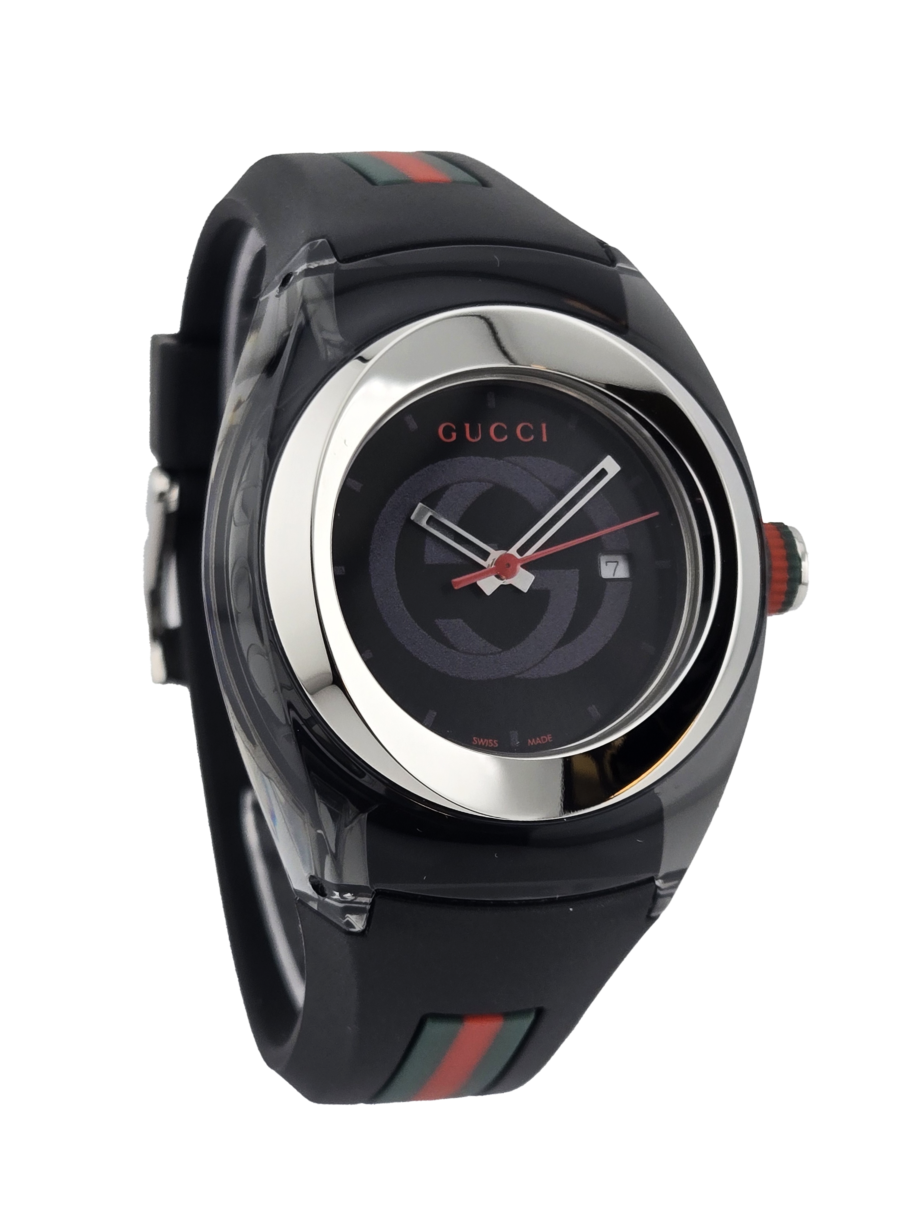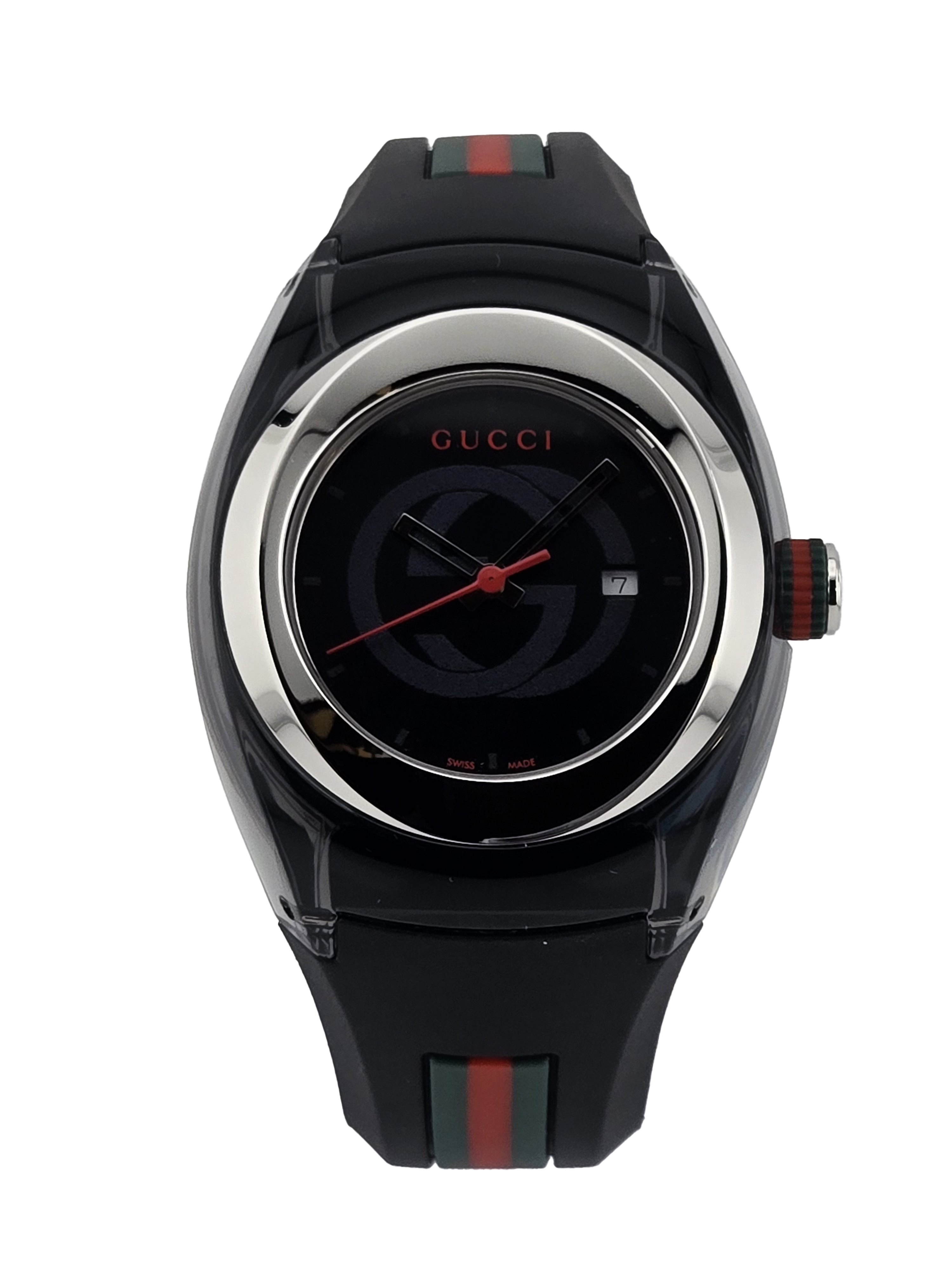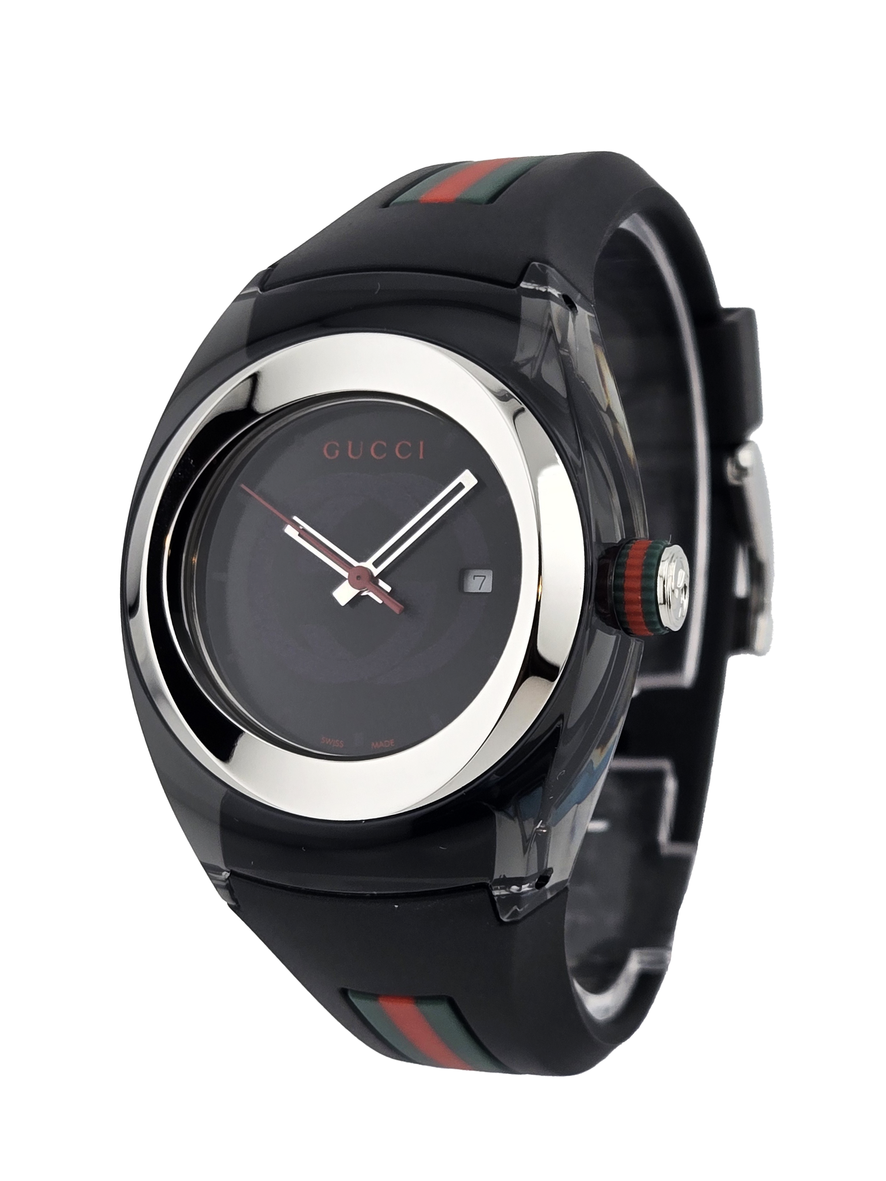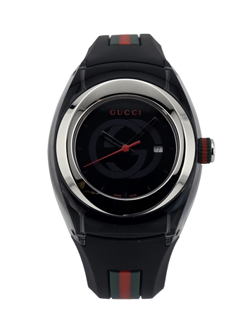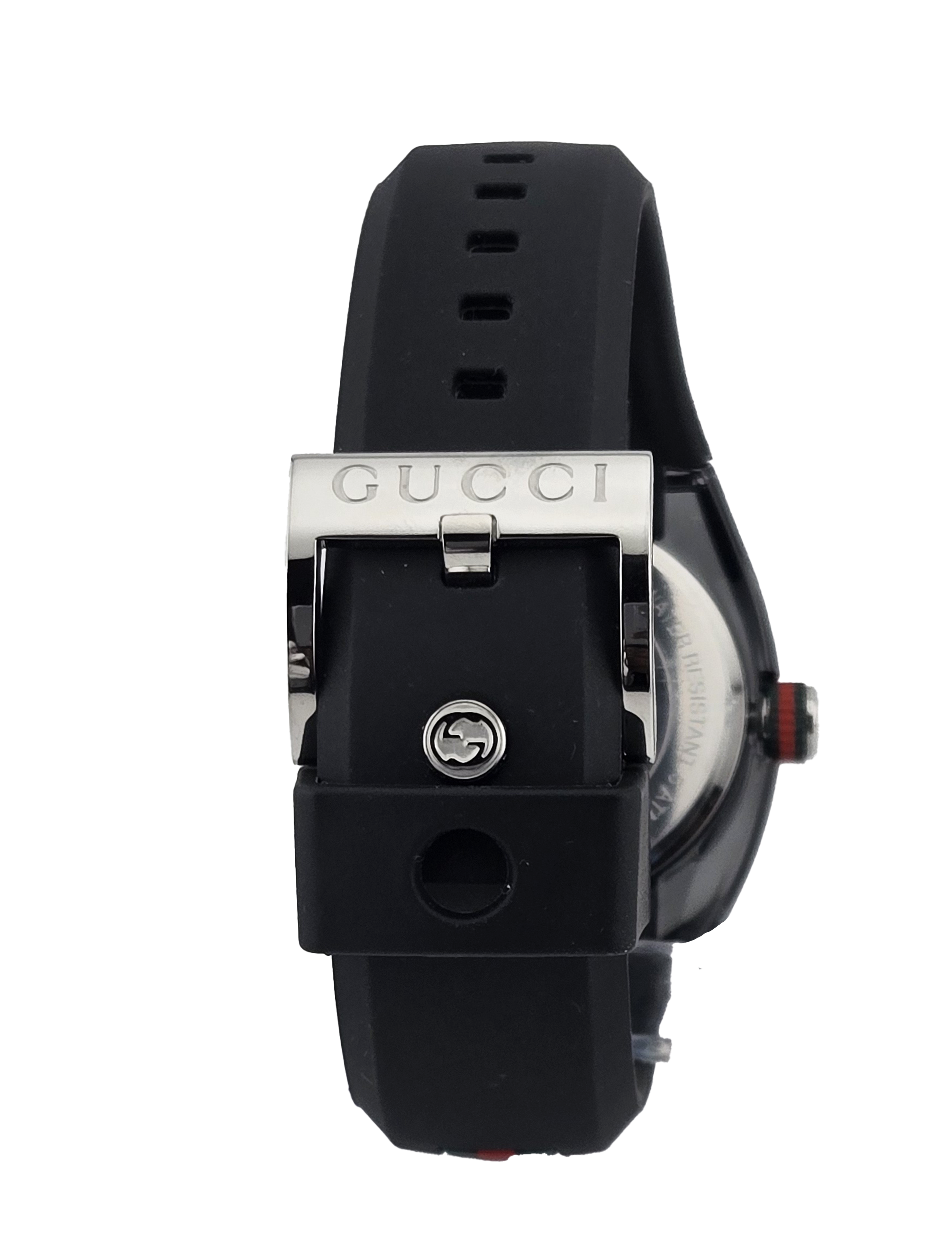 Discover the Gucci Sync L YA137301 Women’s Black Rubber Band Watch. Featuring a 36 mm stainless steel and nylon case, this stylish timepiece boasts Swiss quartz movement and a scratch-resistant sapphire crystal. With a durable rubber strap and water resistance up to 50 meters, it’s the perfect blend of sophistication and functionality.