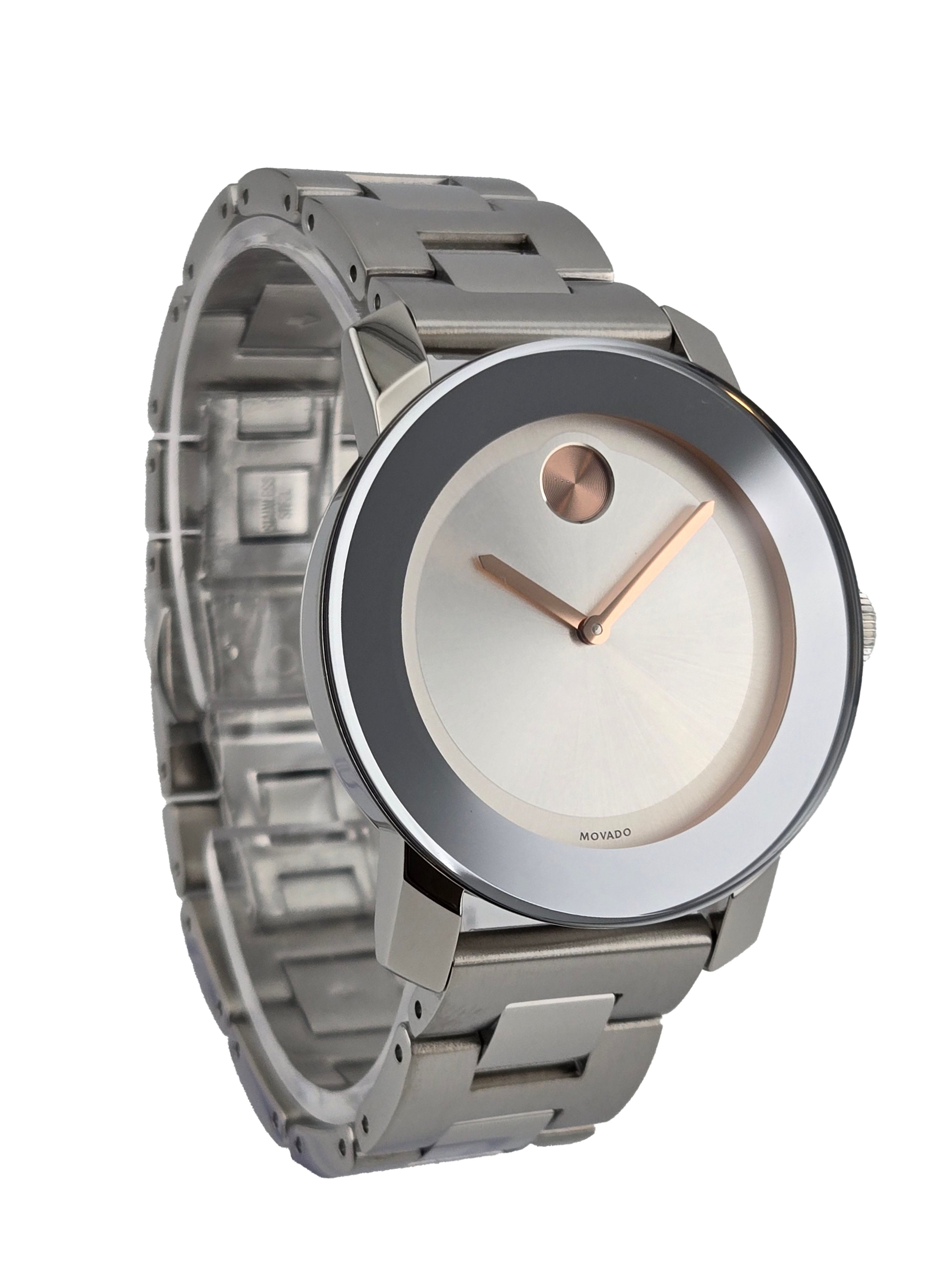 - Rose gold-tone Movado dot appears at the 12 o'clock position.