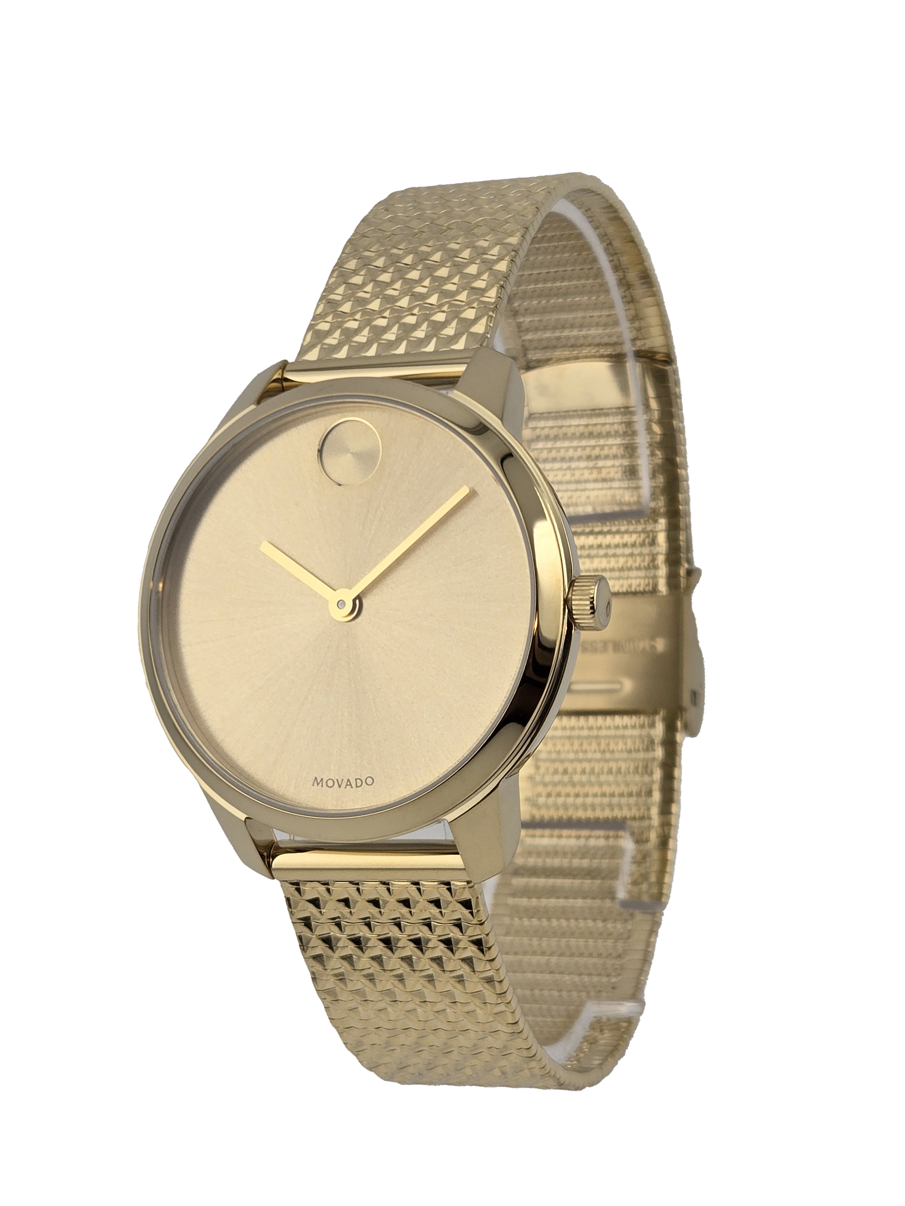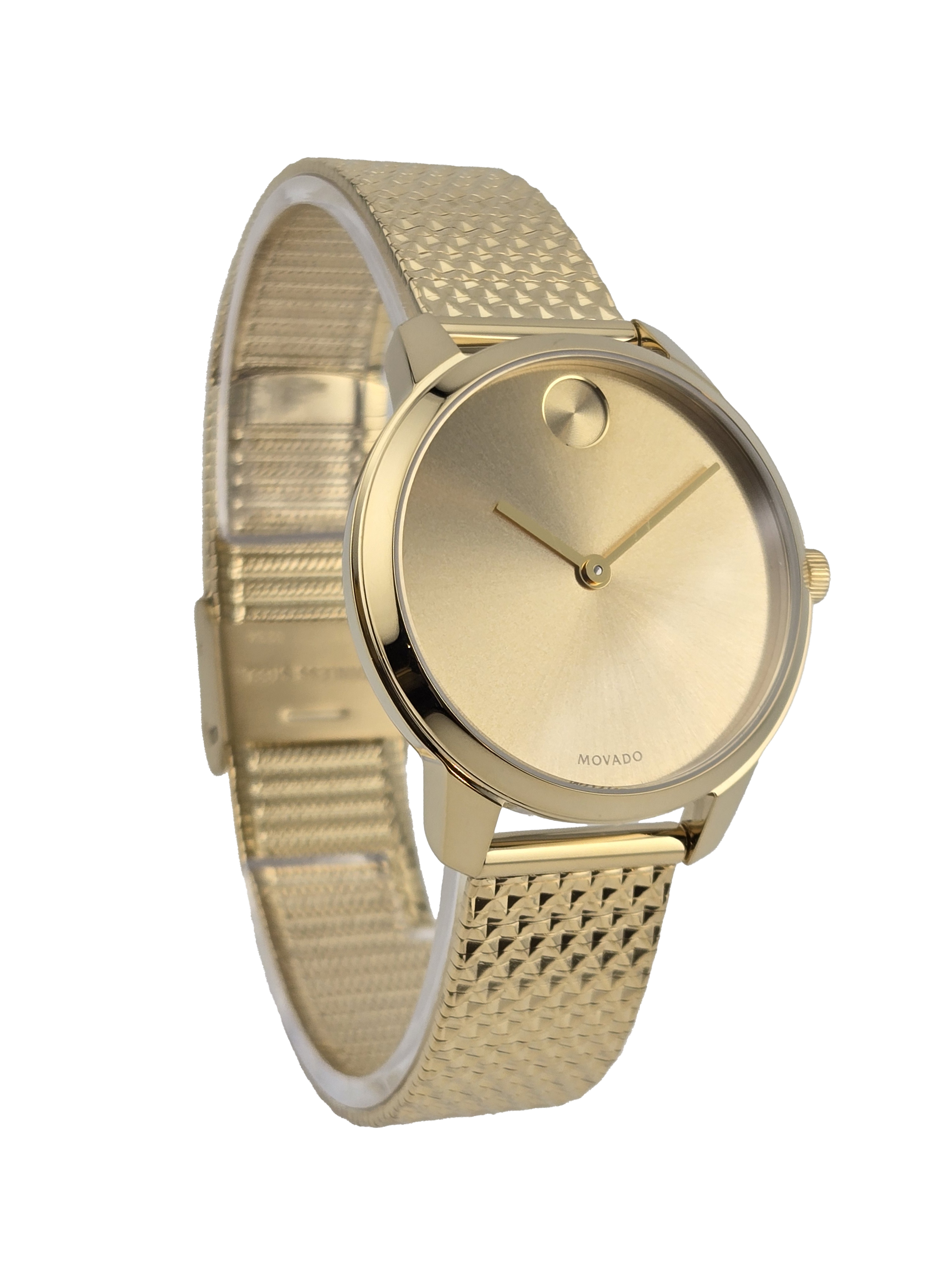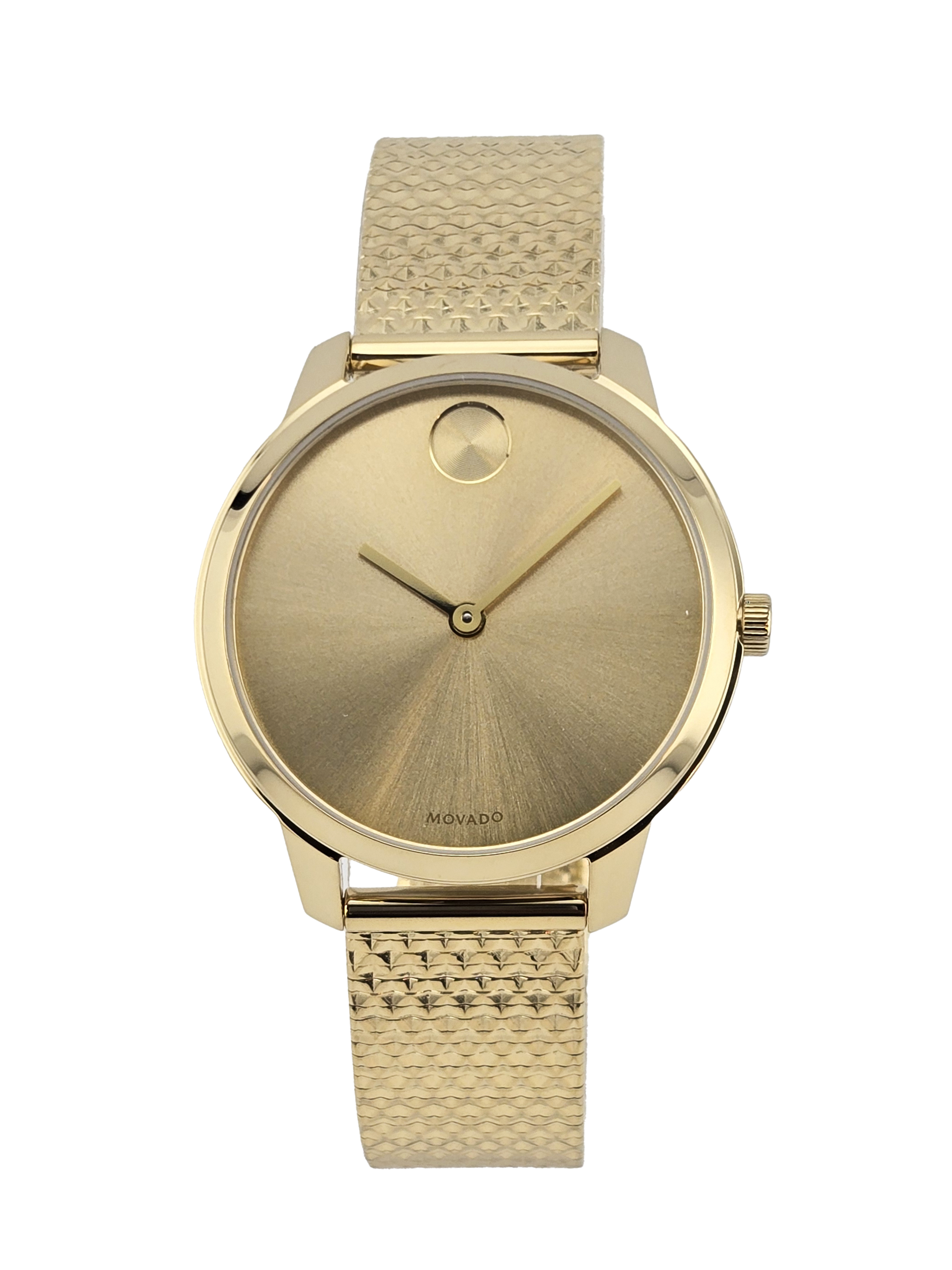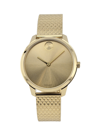The Movado Bold Women's Gold Tone Pyramid Bracelet Watch (Model 3600598) features a gold ion-plated case and pyramid mesh bracelet, with a minimalist gold-tone dial and the iconic Movado dot. Powered by quartz movement, it offers accuracy, 30-meter water resistance, and a comfortable 35mm case with a slide-through clasp for everyday wear.