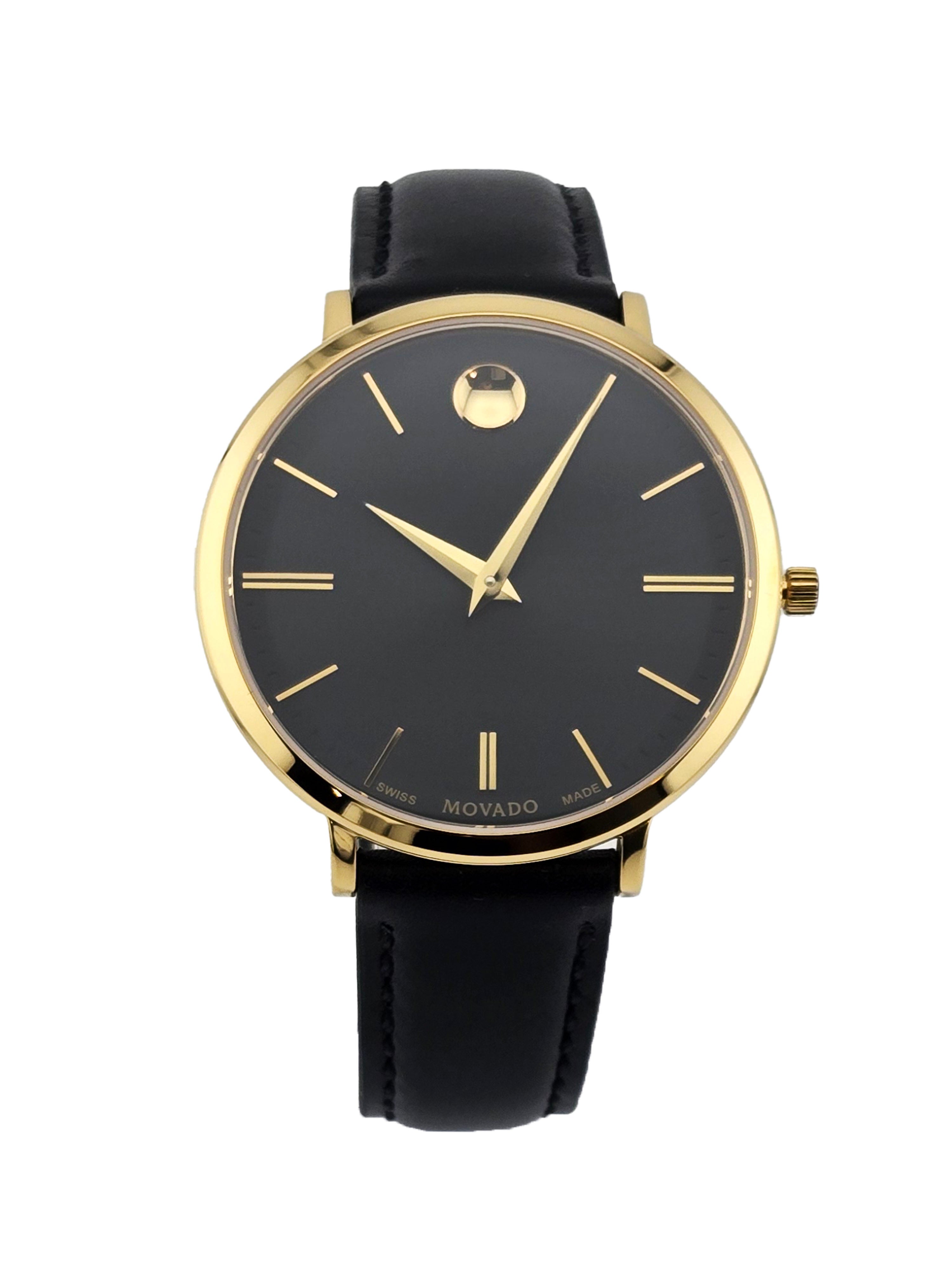 The Movado 0607091 Women's Ultra Slim Watch features a 35mm yellow gold-plated stainless steel case, black dial, and gold-tone dauphine hands. It has a black leather strap with a pin buckle clasp and a scratch-resistant sapphire crystal. Powered by Swiss quartz movement, it offers water resistance up to 30 meters. A sleek, elegant timepiece perfect for everyday wear.