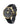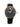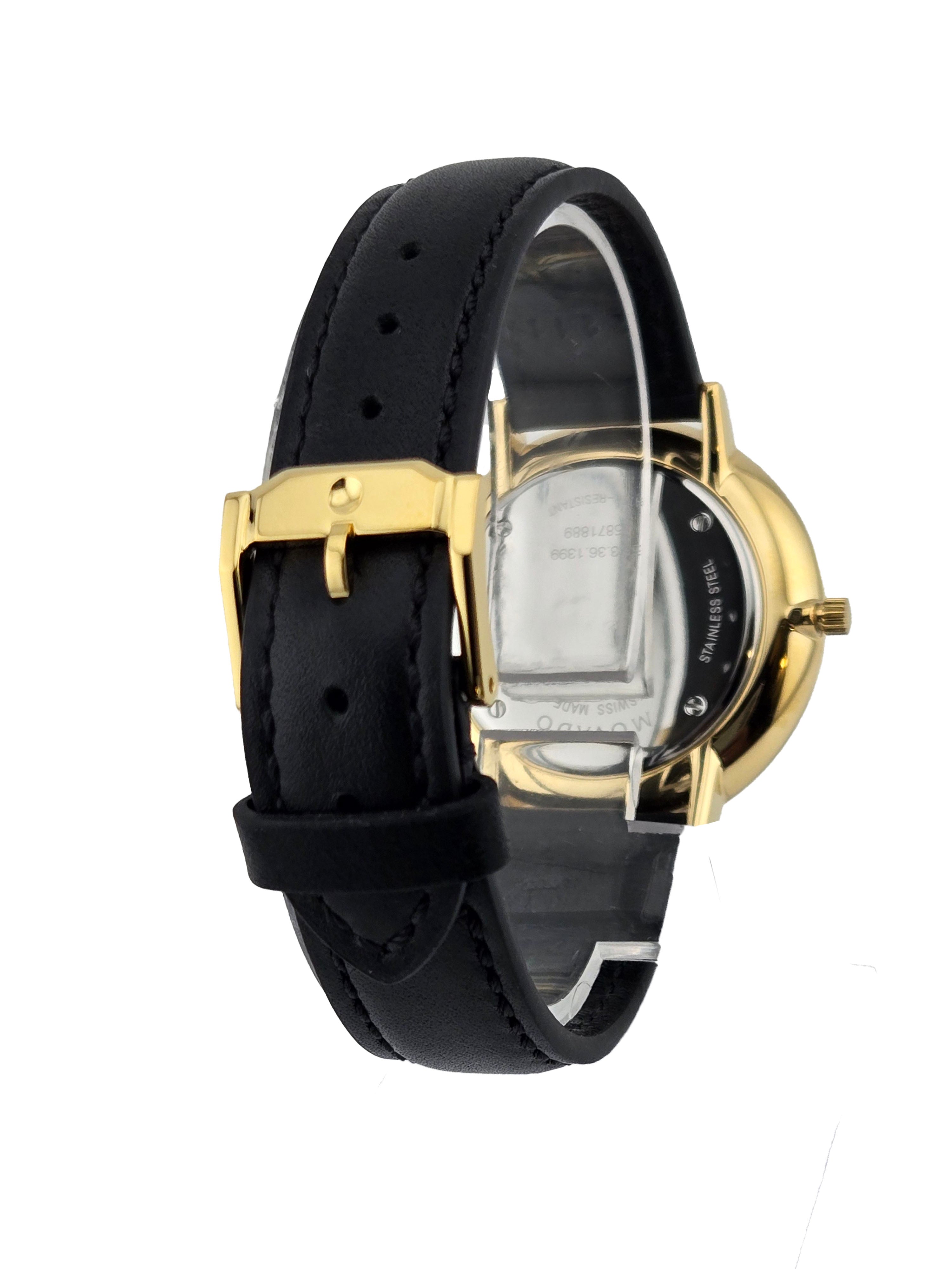 - Yellow gold PVD stainless steel case with a black (calfskin) leather strap.